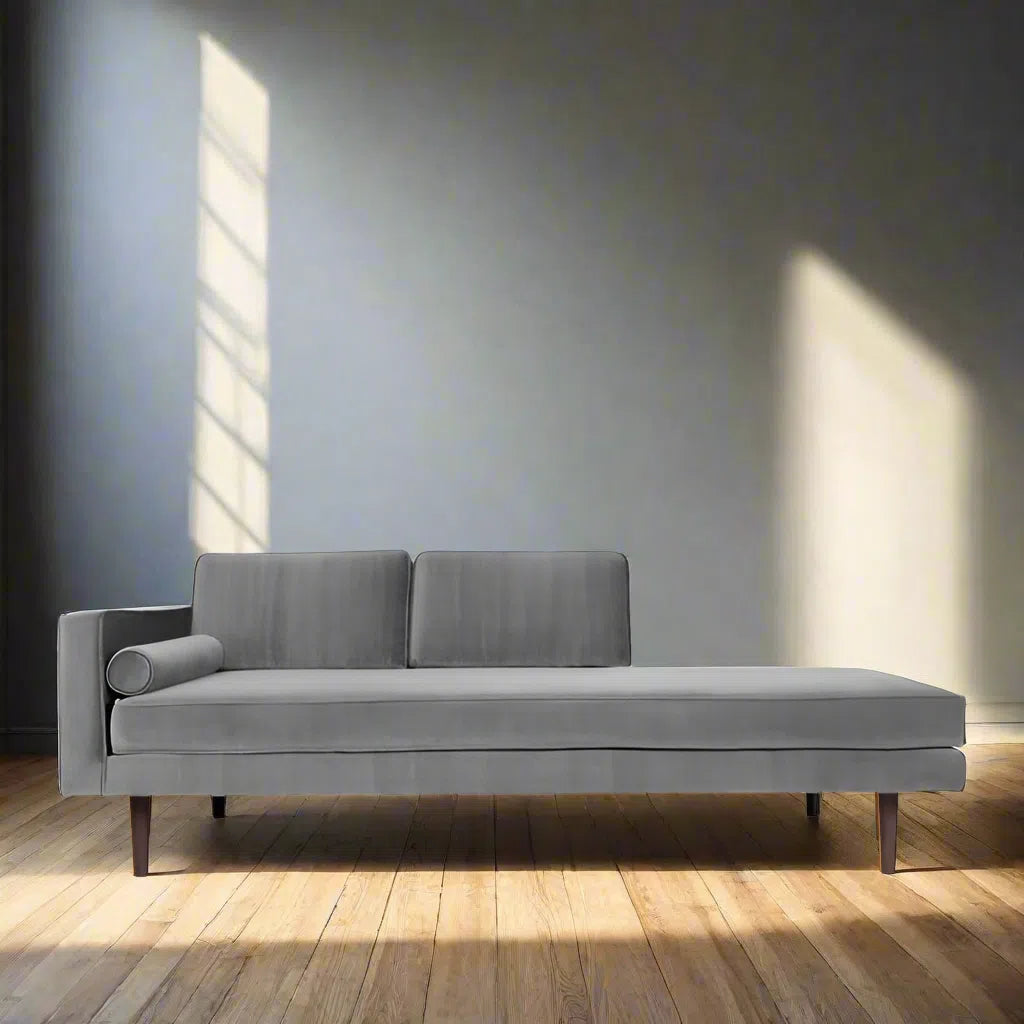 Experience the perfect blend of style and comfort with Broste Copenhagen's Wind Velvet Chaise Longue in Drizzle Grey – Left Sided. This contemporary piece offers medium to firm CME foam seating, ensuring an ideal balance of support and relaxation. Designed for modern living, it features two back cushions and a side bolster cushion for added comfort and visual appeal.