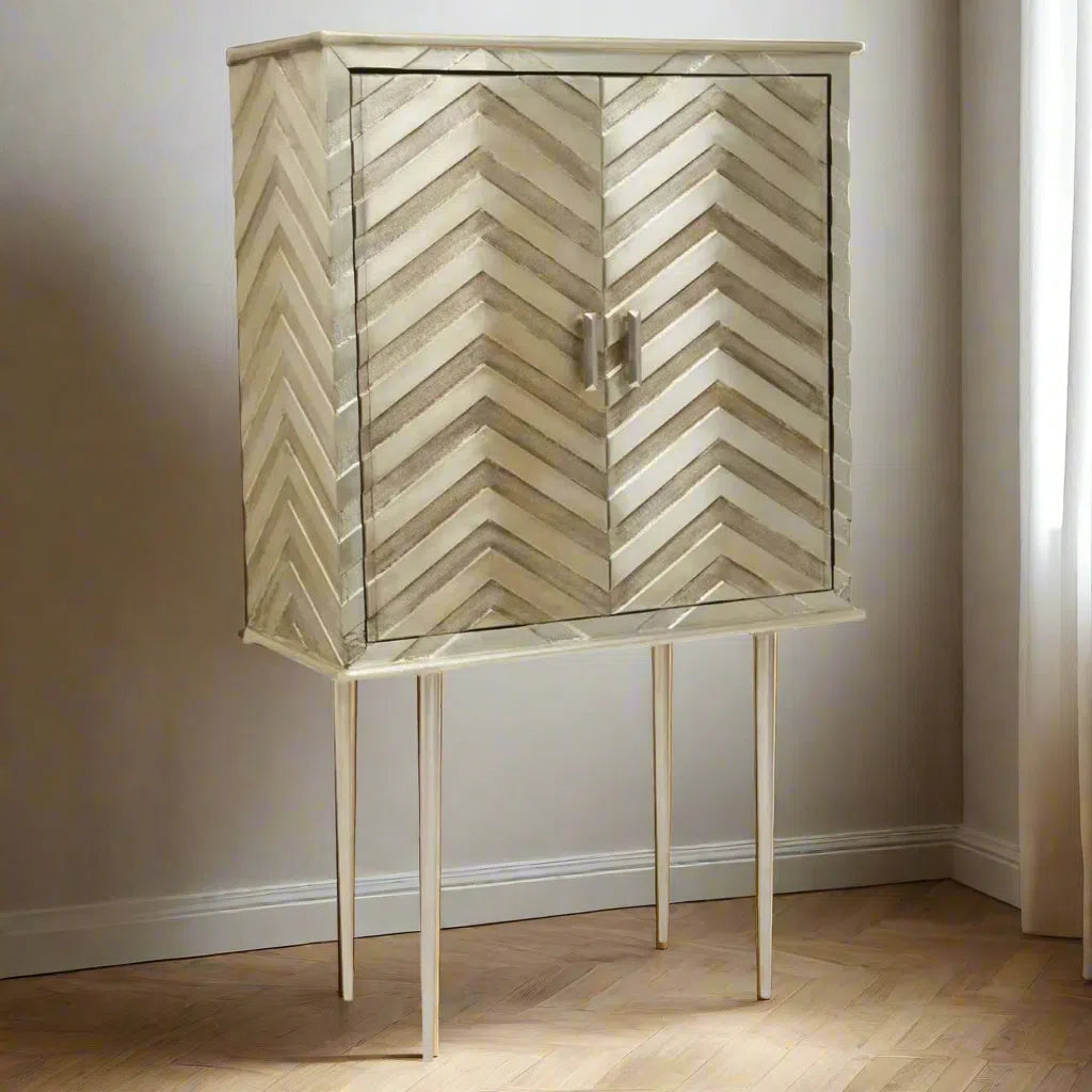 This two-door cabinet showcases a luxurious blend of mango wood with rich gold and silver accents, forming an elegant chevron pattern.