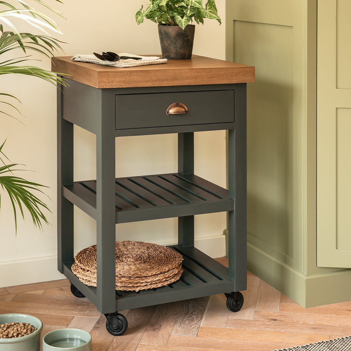 Charming and practical in equal measure, our Walcote Butchers Block brings a cosy country kitchen aesthetic and useful extra worktop space to the heart of the home. Crafted from forest green Bayur wood and hand-finished by talented Indonesian artisans, this beautiful butchers block has black castor wheels so that it’s easy to move around.