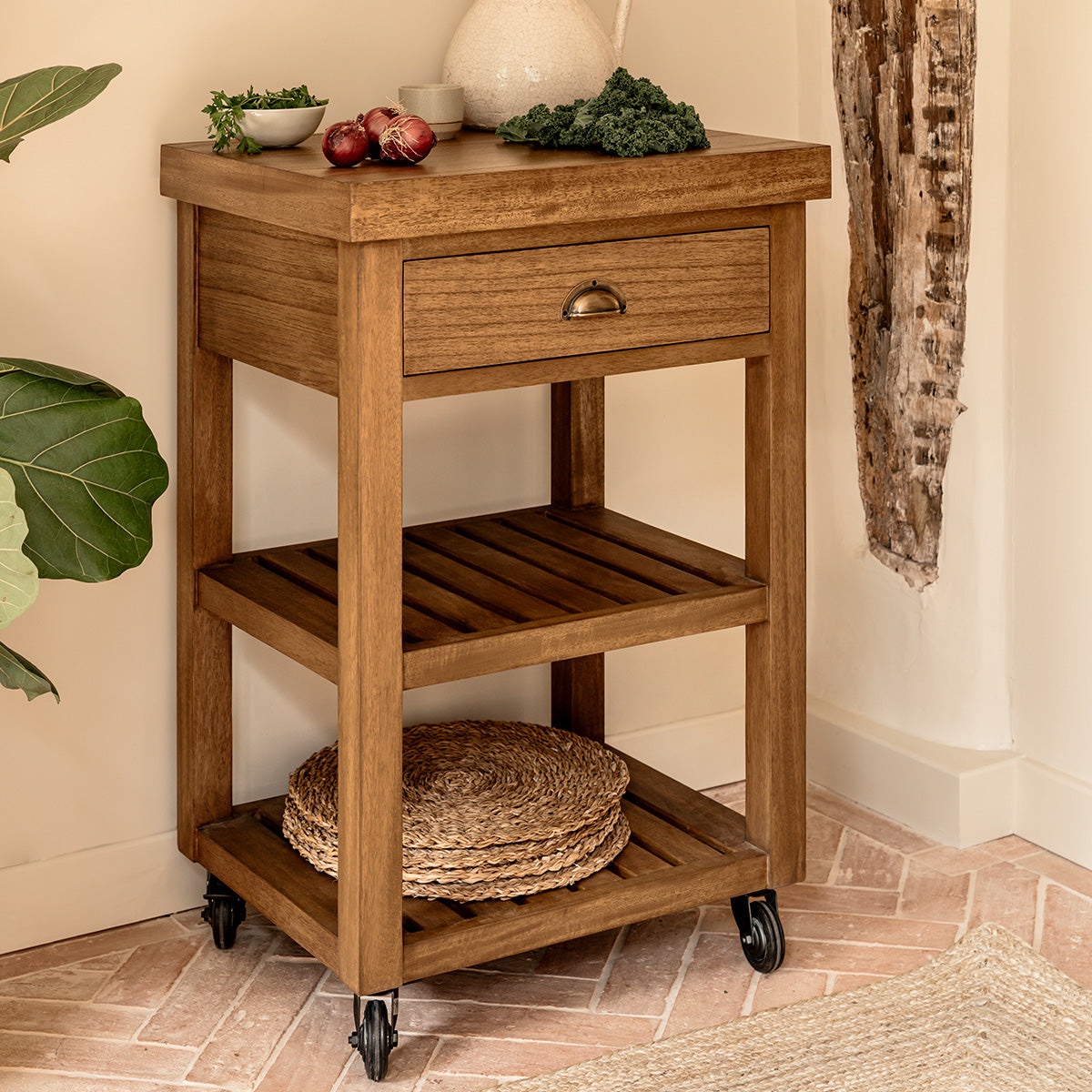 The Walcote Butchers Block is the perfect blend of rustic charm and practicality, bringing extra worktop space and ample storage to your kitchen. Crafted from natural Bayur wood, this piece is hand-finished by skilled artisans in Indonesia, showcasing a timeless cottage aesthetic. The block is designed with black castor wheels for easy repositioning, making it as functional as it is stylish.