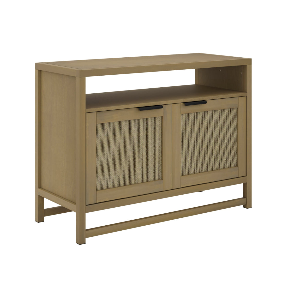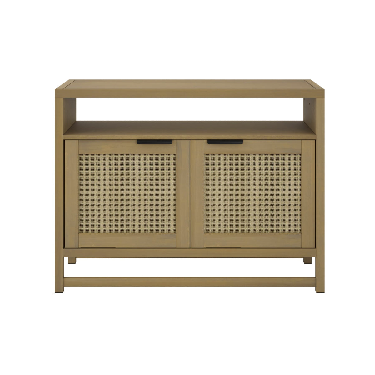 The Shore cabinet brings a blend of texture and elegance to your space with its latte-coloured pine veneer and sleek matte grain finish. Featuring rattan weave front doors and black metal handles, this piece combines modern design with timeless appeal.