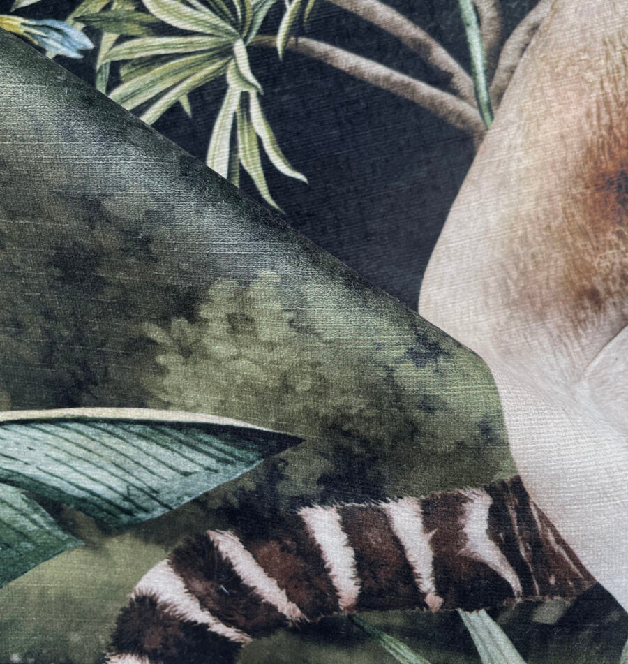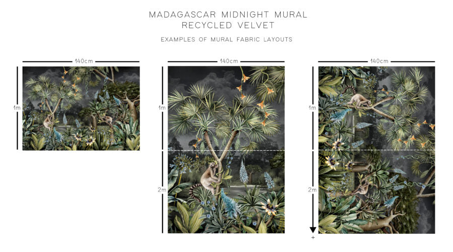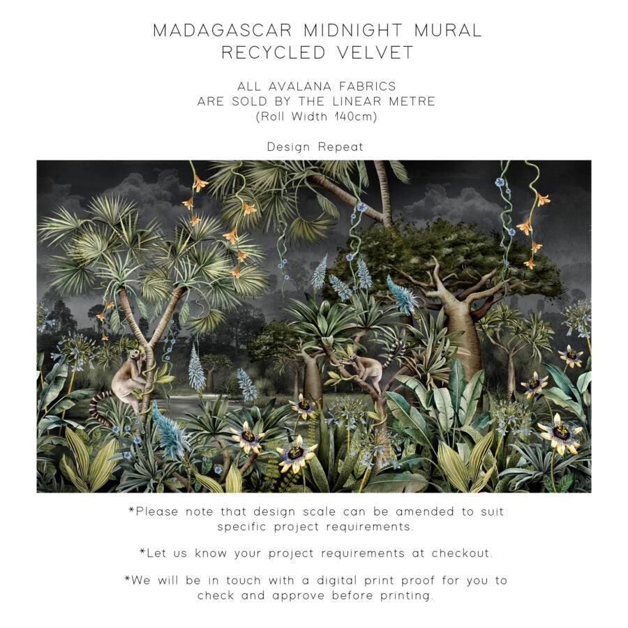 Unleash your imagination into a stunning Madagascan dreamscape with Midnight Gardens Recycled Velvet Fabric. Be mesmerised by the majestic moonlit beauty, hand-painted with ring-tailed lemurs scaling the vine-entwined trees. Exotic flowers bloom on the rainforest floor, intertwining with vines from the canopy above.