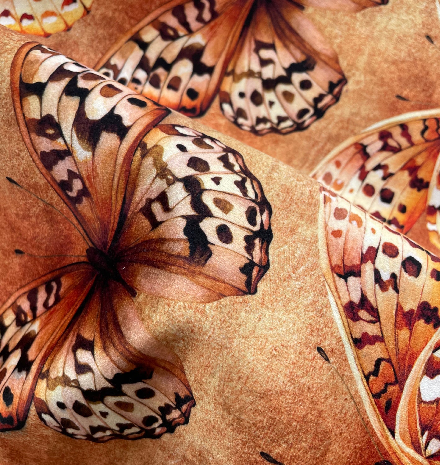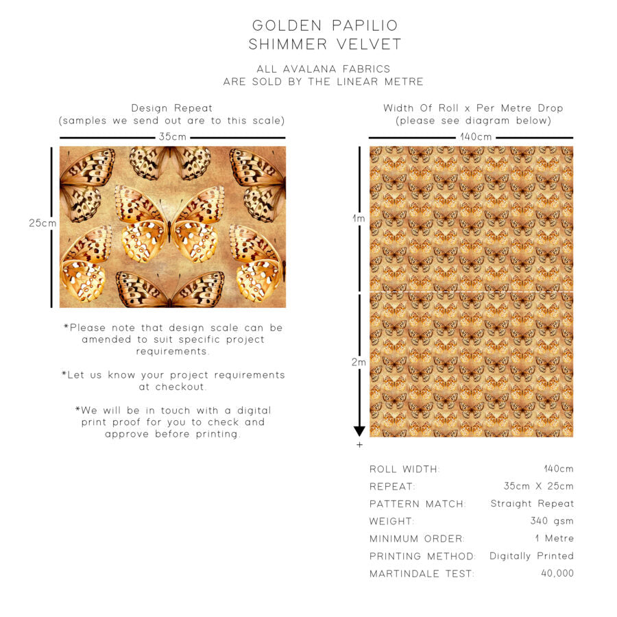 Inspired by the UK's most endangered species, the Argynnis Adippe, these hand painted butterflies feature a stunning mix of gold and amber inks that perfectly recreate the intricate wing patterns. Ideal for upholstery and soft furnishing projects. Ideal for upholstery and soft furnishing projects.