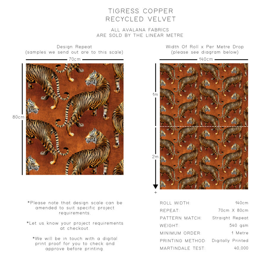 The exquisite Tigress Recycled Velvet Fabric features hand-painted copper watercolor textures that add a touch of luxury and uniqueness to any interior space. The stunning motif layout perfectly captures the beauty of a painted Tigress, creating a harmonious design with a captivating animal print.