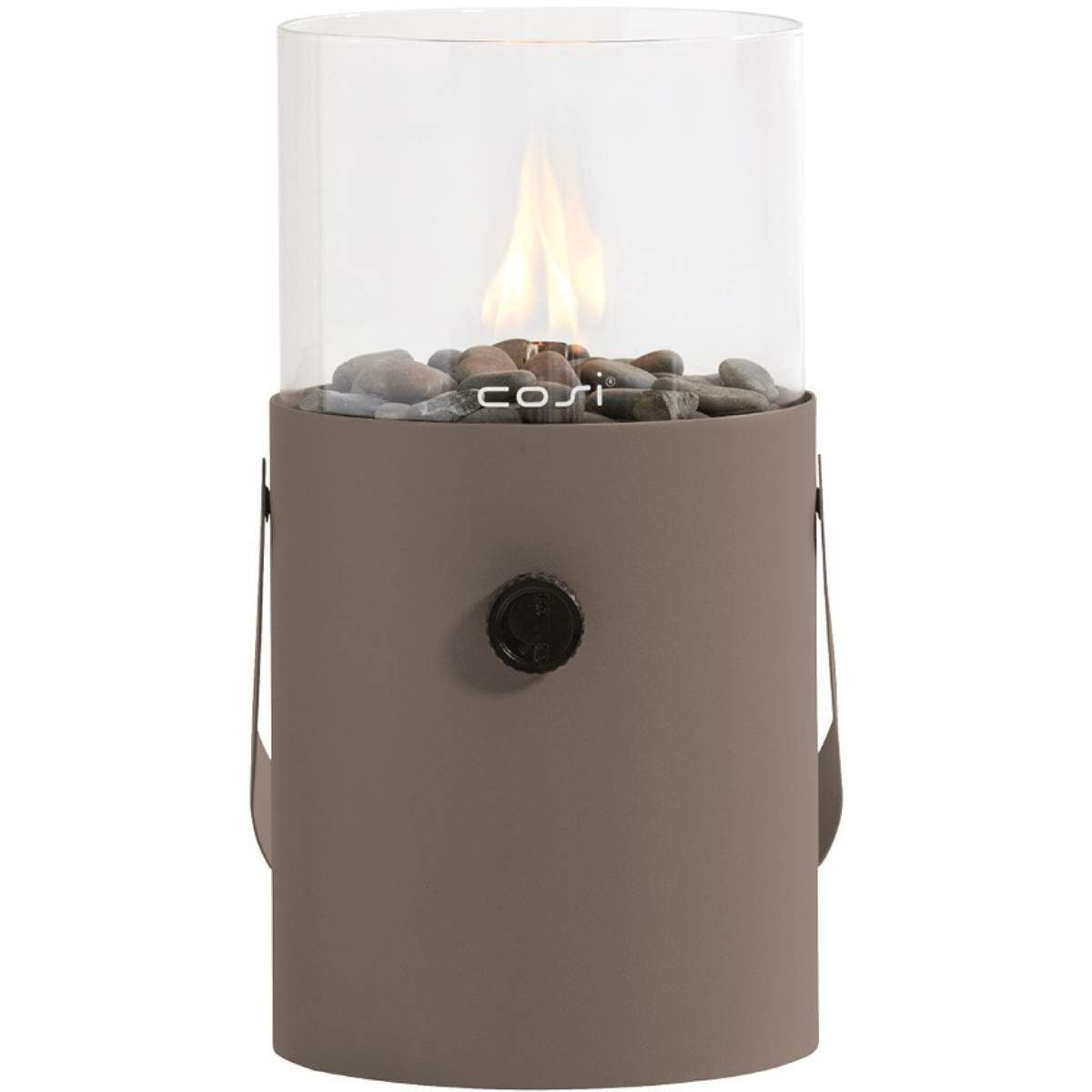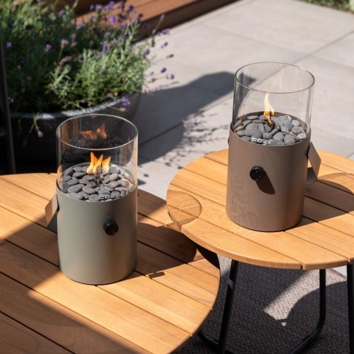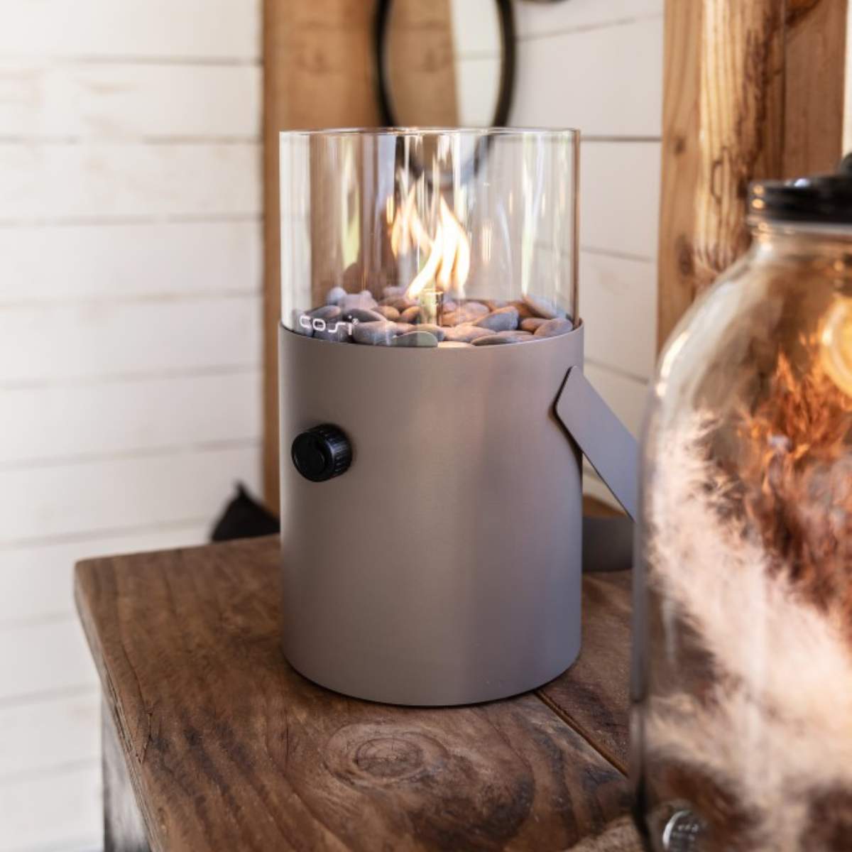 The portable metal and glass Cosiscoop clay fire lantern with decorative pebbles can be kept in your garden or taken on road trips.