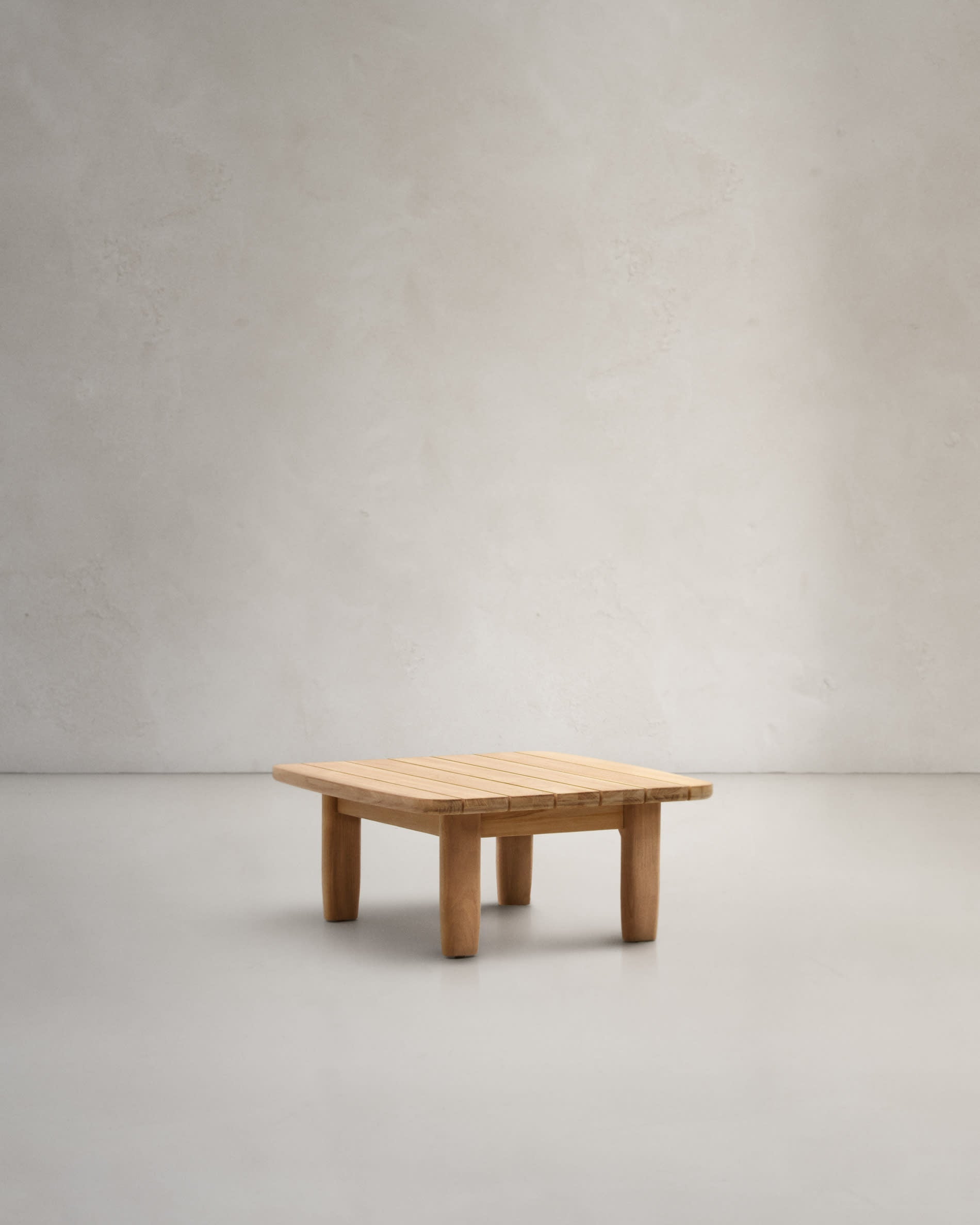 The side table made from solid teak wood, which is 100% FSC chain-of-custody certified and sourced from a responsible forest management model. Suitable for outdoor use. To maintain its quality, apply acacia wood maintenance products at least once a year. This exclusive design by Made Studio for Kave Home can be combined with the rest of the collection.