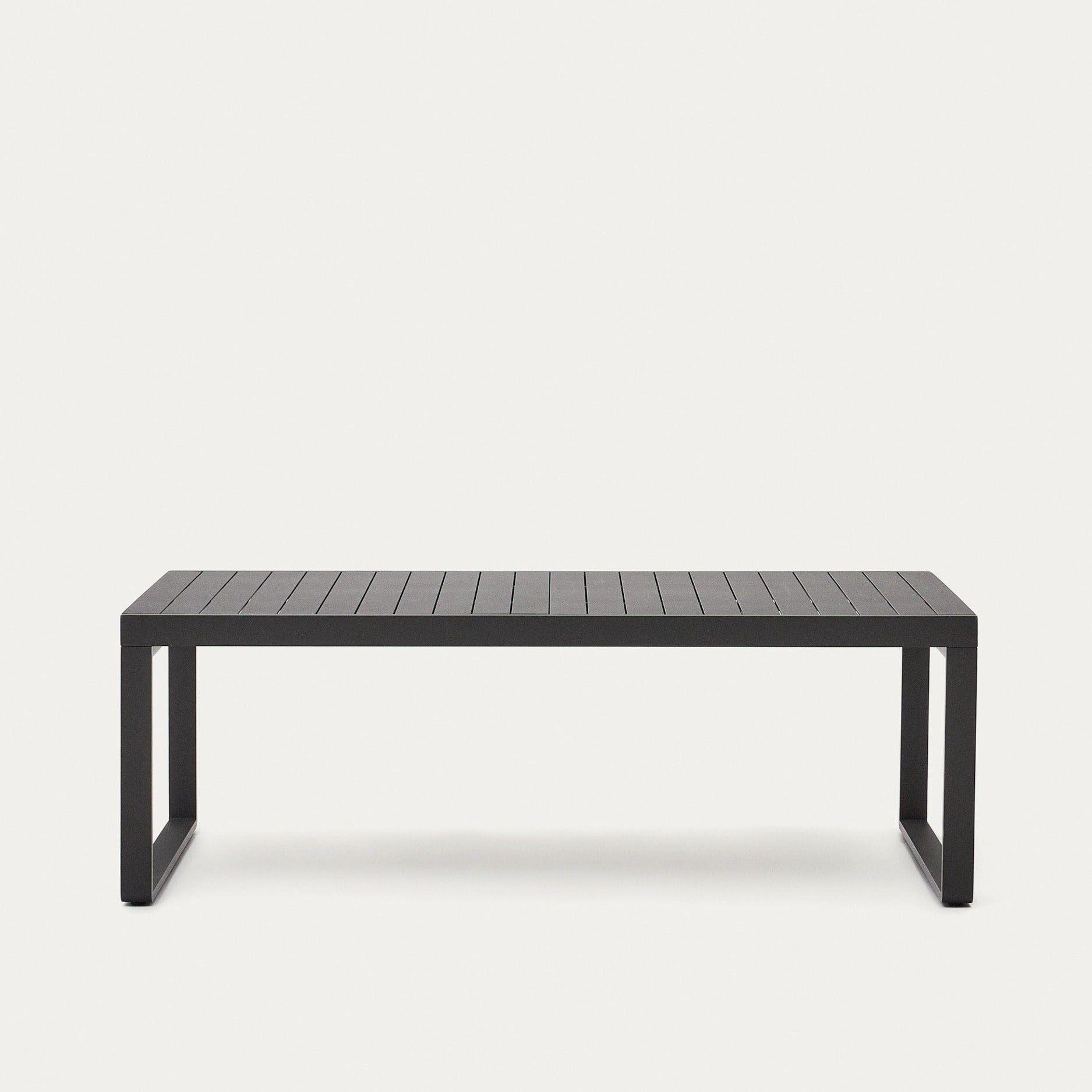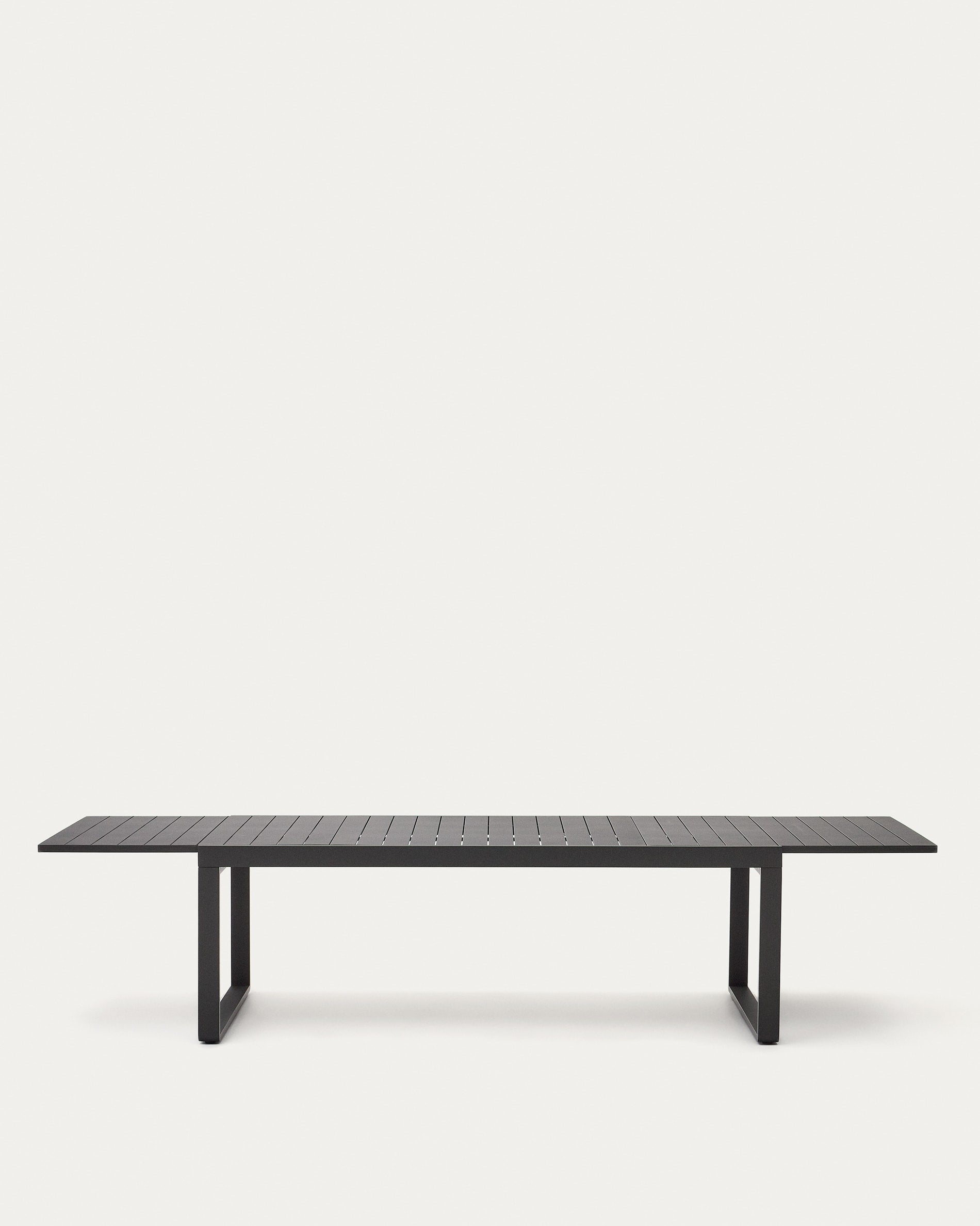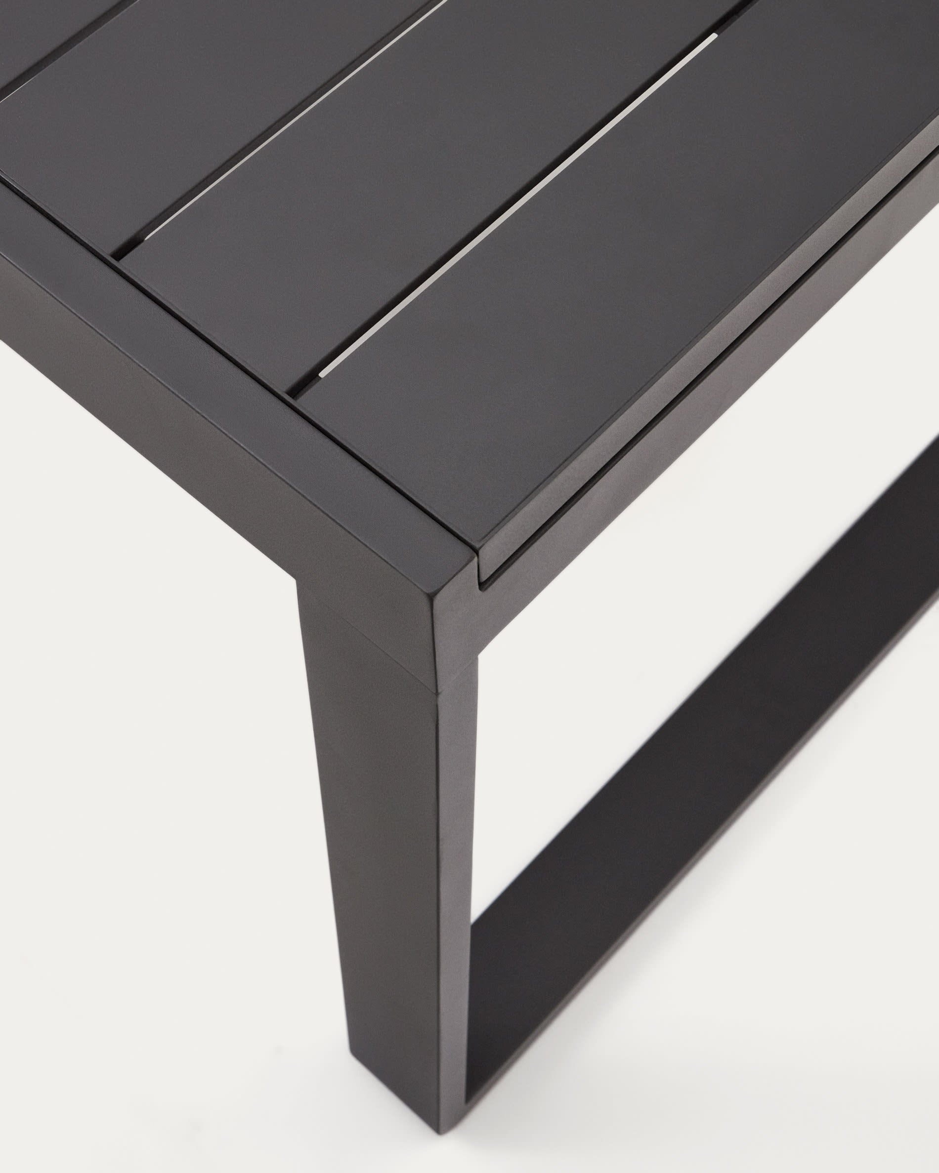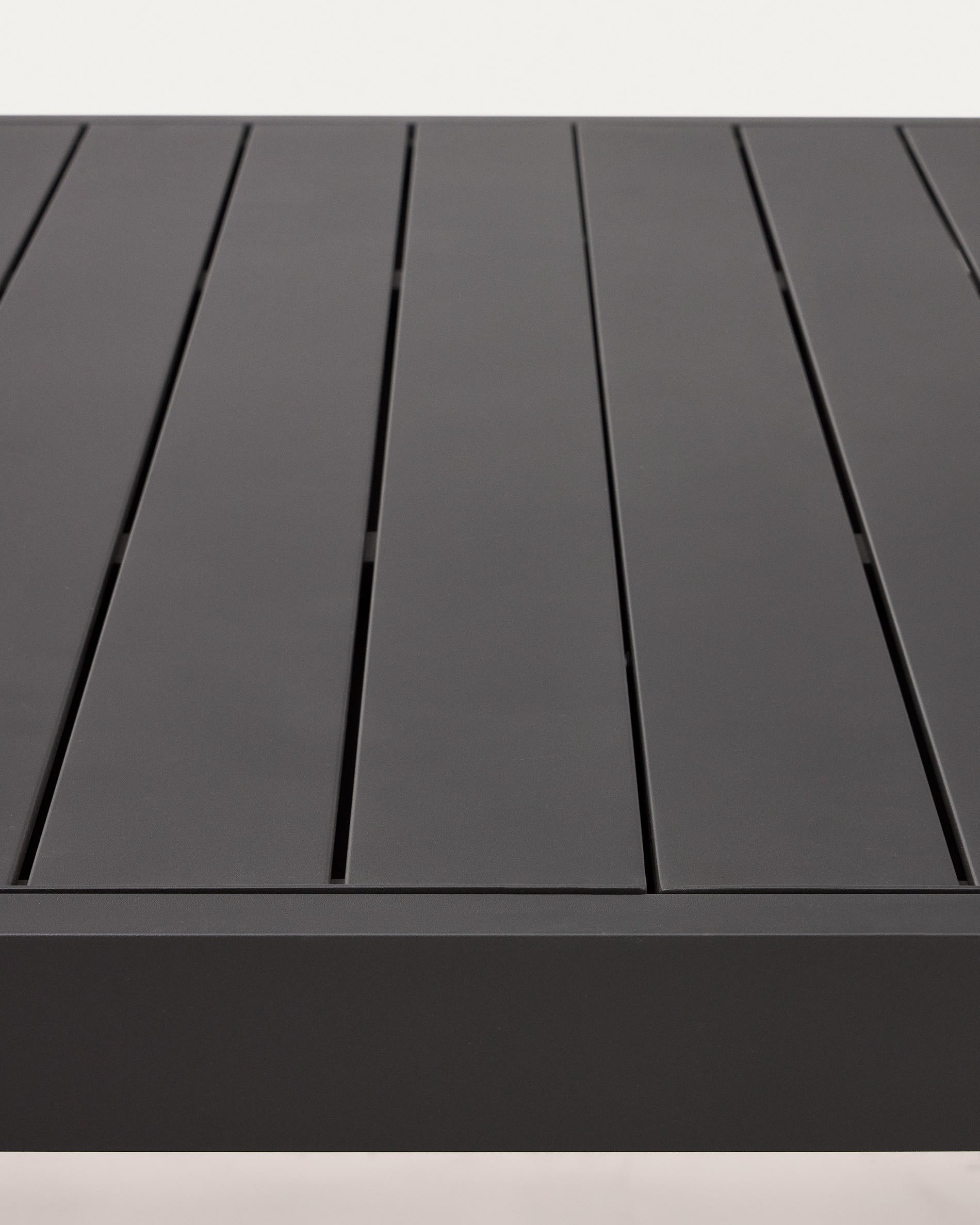 Extendable table made of aluminium with a black finish. Crafted with lightweight materials, it is 100% suitable for outdoor use and resistant to oxidation, corrosion, and UV rays. The table includes a concealed 120 cm extension stored inside.