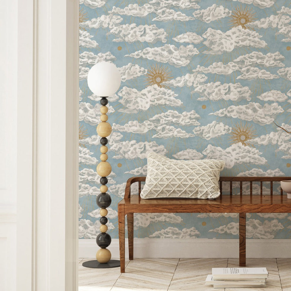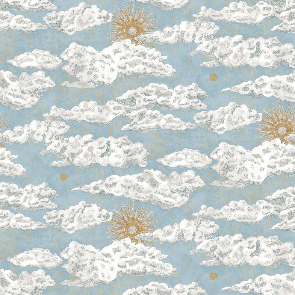 The whimsical composition and naïve nature of this design creates a striking wall covering. Cumulus Sol has a stylised sun.
