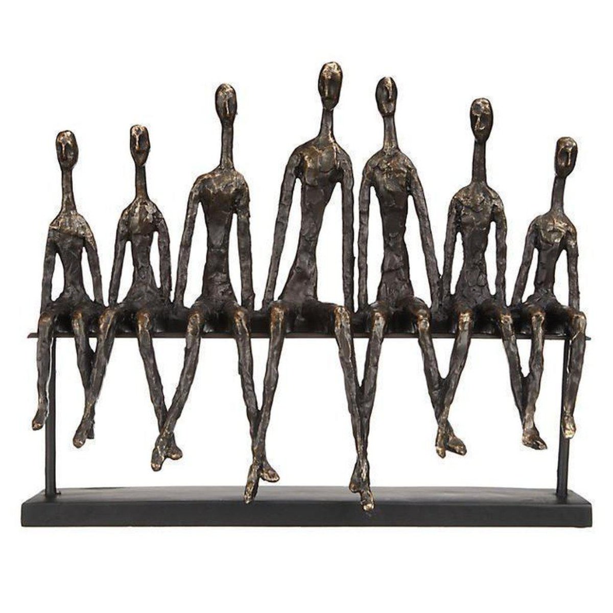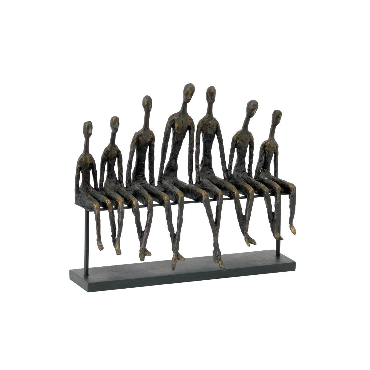 This sculpture features a group of friends seated together on a bench, crafted from a bronze-coloured resin with a textured finish, capturing the warmth and joy of friendship.