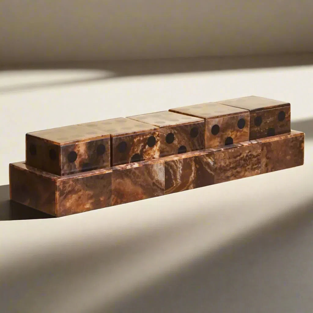 Crafted from premium quality resin, this Five Dice Set adds a touch of refined elegance to any space. The set features a striking two-tone contrast, with brown and black dice neatly arranged in a rectangular tray with raised edges for easy organisation.