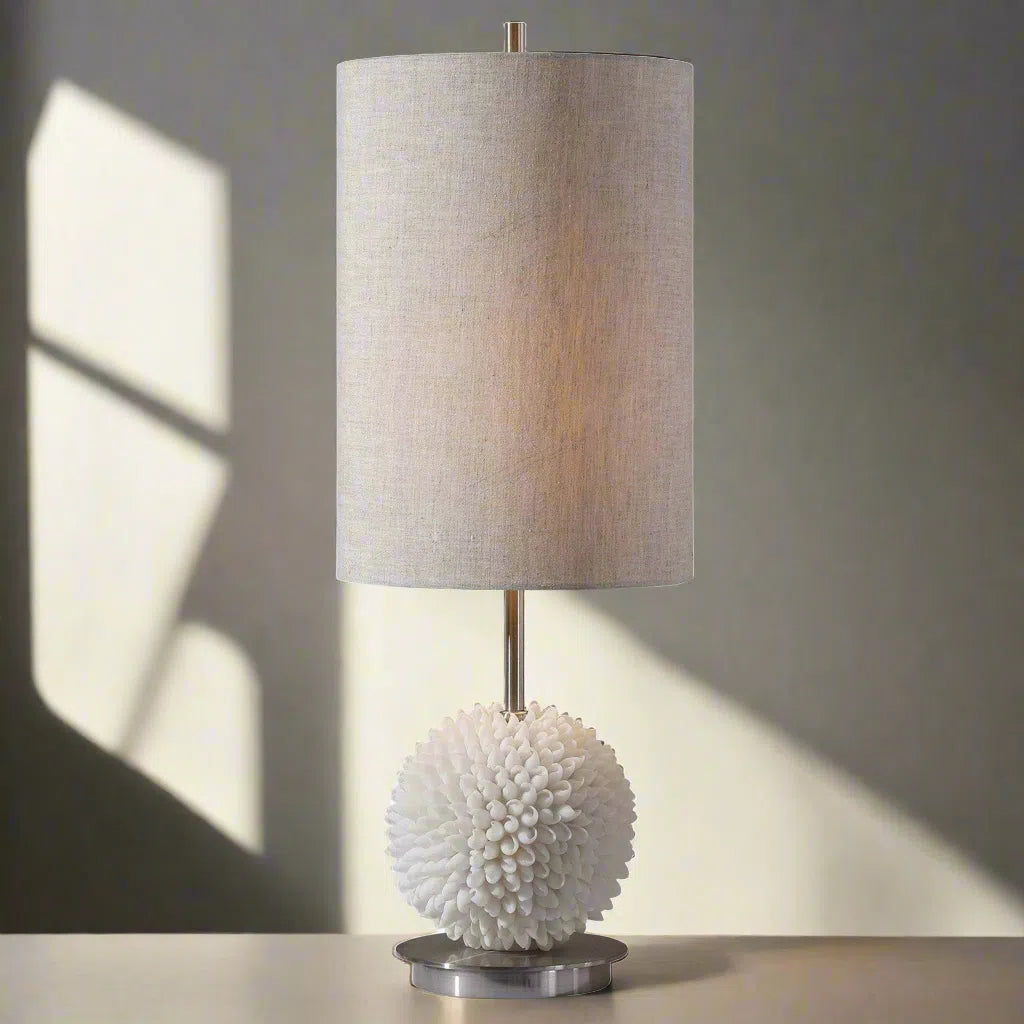 Discover elegance with the Cascara Lamp, handcrafted with precision, this decorative sphere-shaped lamp features faux sea shells intricately accented with brushed nickel-plated details.