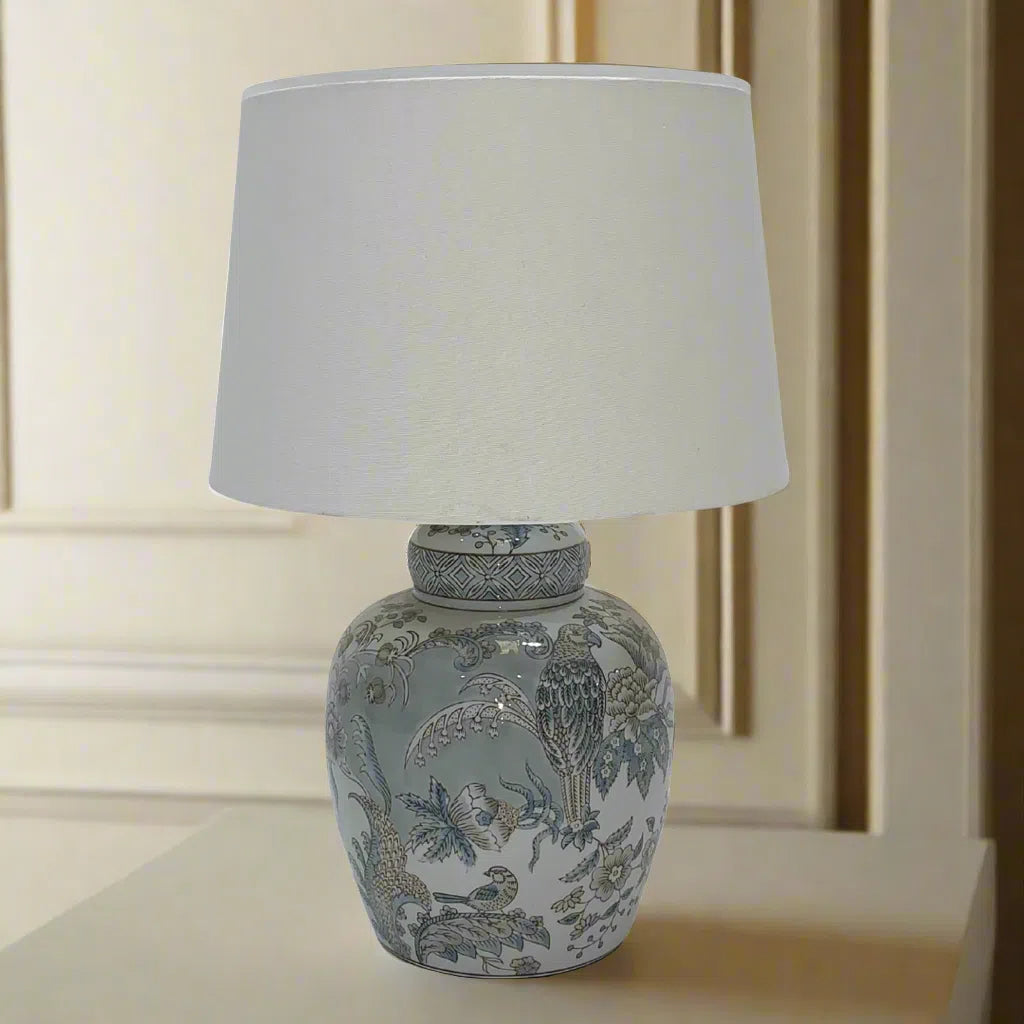 Our timeless and traditional ceramic collection is the perfect addition to your home. With stunning designs, prints, and patterns bursting with colour, this lamp in light blue and grey effortlessly complements any space.