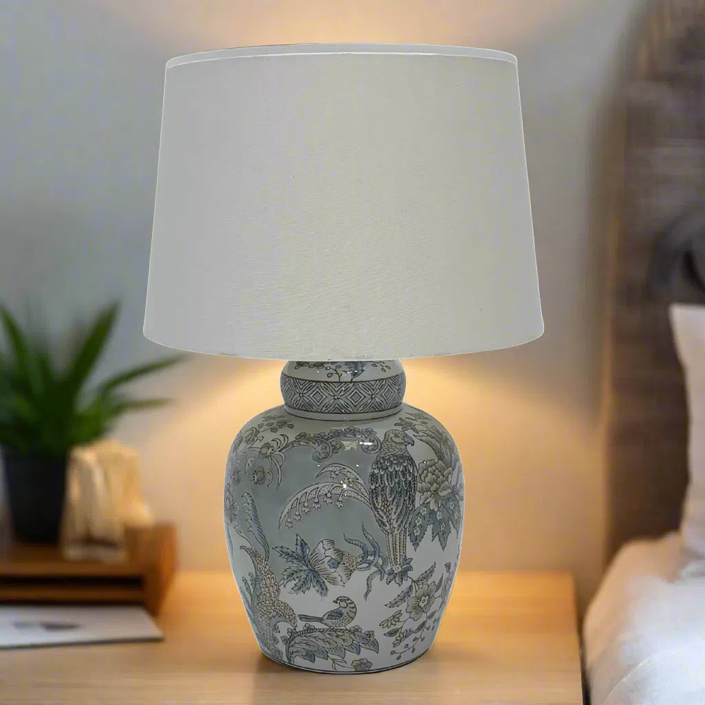 The tropical print design and white linen shade add a touch of elegance and sophistication, making it a must-have for your interior design needs. Bring warmth and style to your home with our Delia Lamp Small.