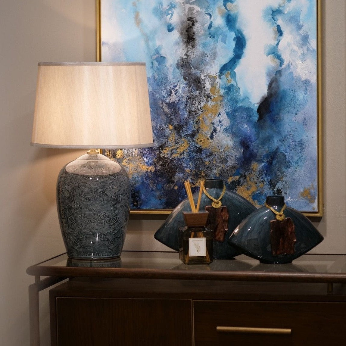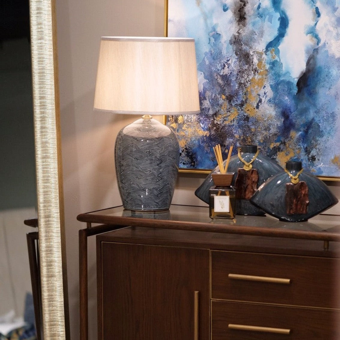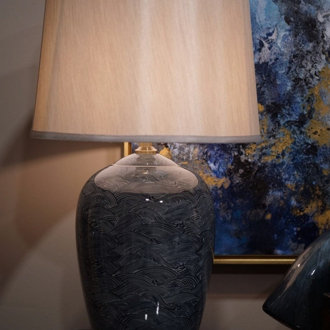 Good lighting is essential for every home. Our ceramic collection is traditional yet timeless and features stunning designs, prints and patterns bursting with colour. This lamp features blue and navy wave details with a taupe linen shade.