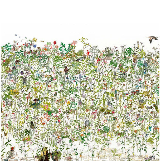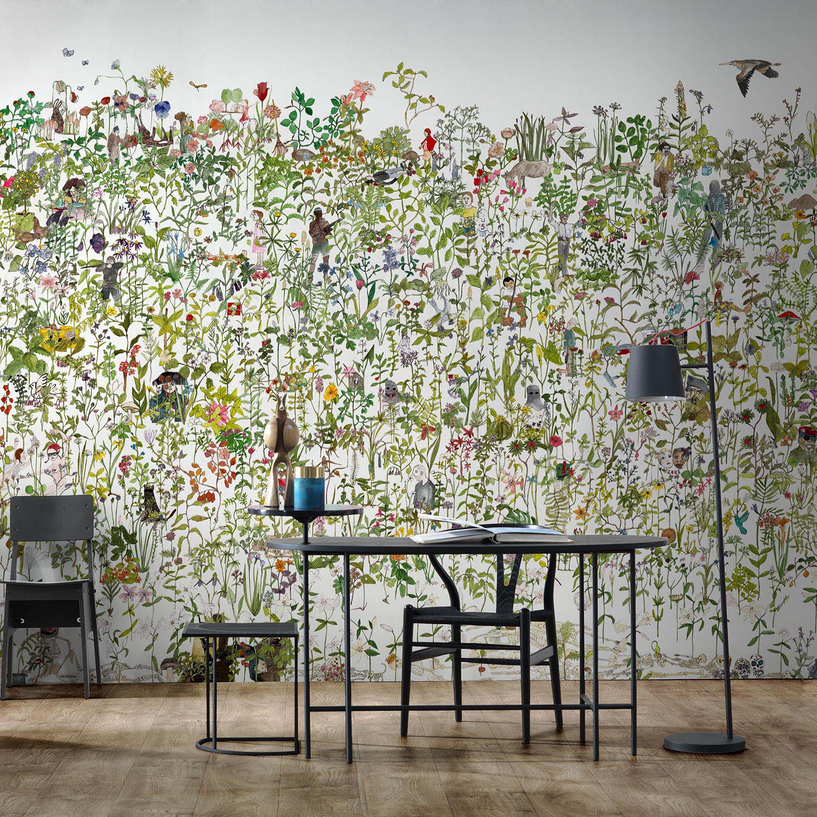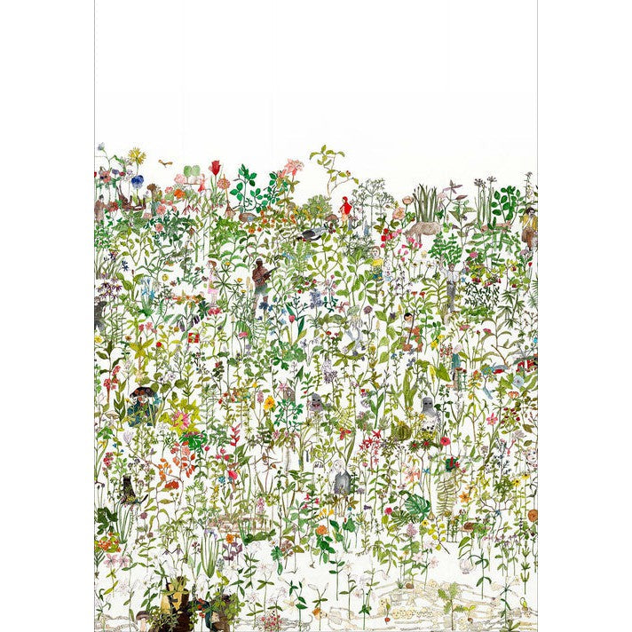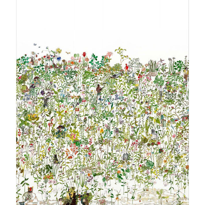 NLXL Enchanted Garden Mural Wallpaper ASU-01 by Anna Surie shows a romantic flowery landscape, made of paper cuts. Heavy-duty wallpaper with paper top-layer and non-woven backing. Colourfast and washable with a soft cloth.
