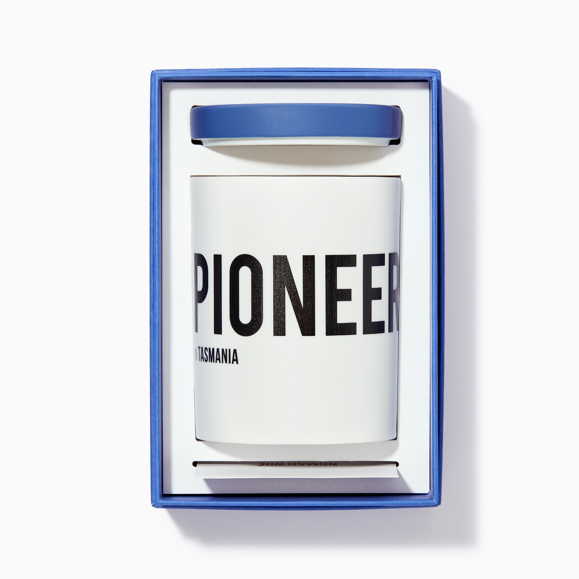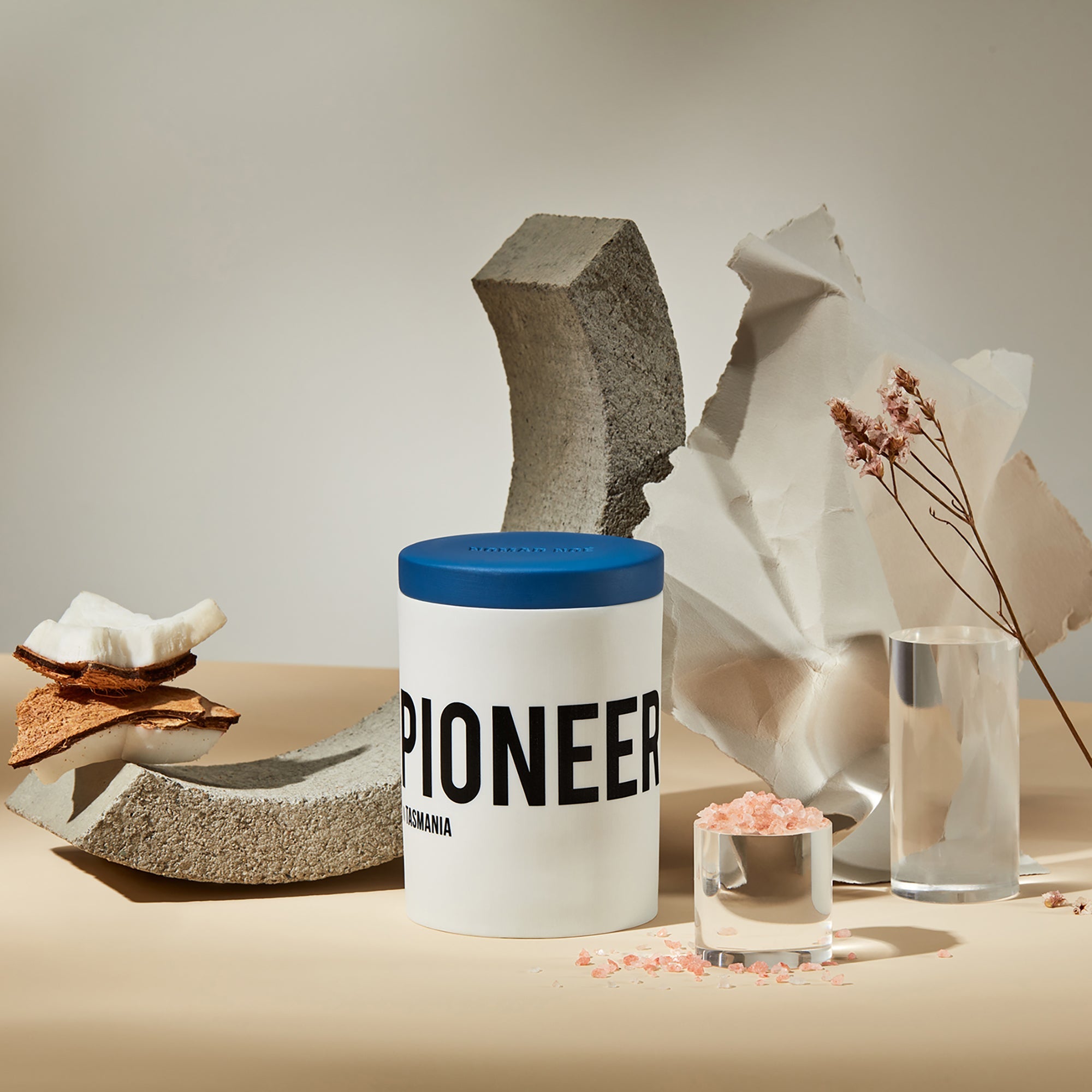 A luxury scented candle presented in a porcelain vessel, hand-poured from a vegetable wax blend and French-crafted fragrance oils including sea salt, coconut and laurel. PIONEER in Tasmania is inspired by freedom and endless opportunities found in perfect summer days.