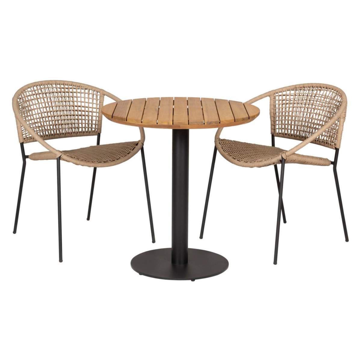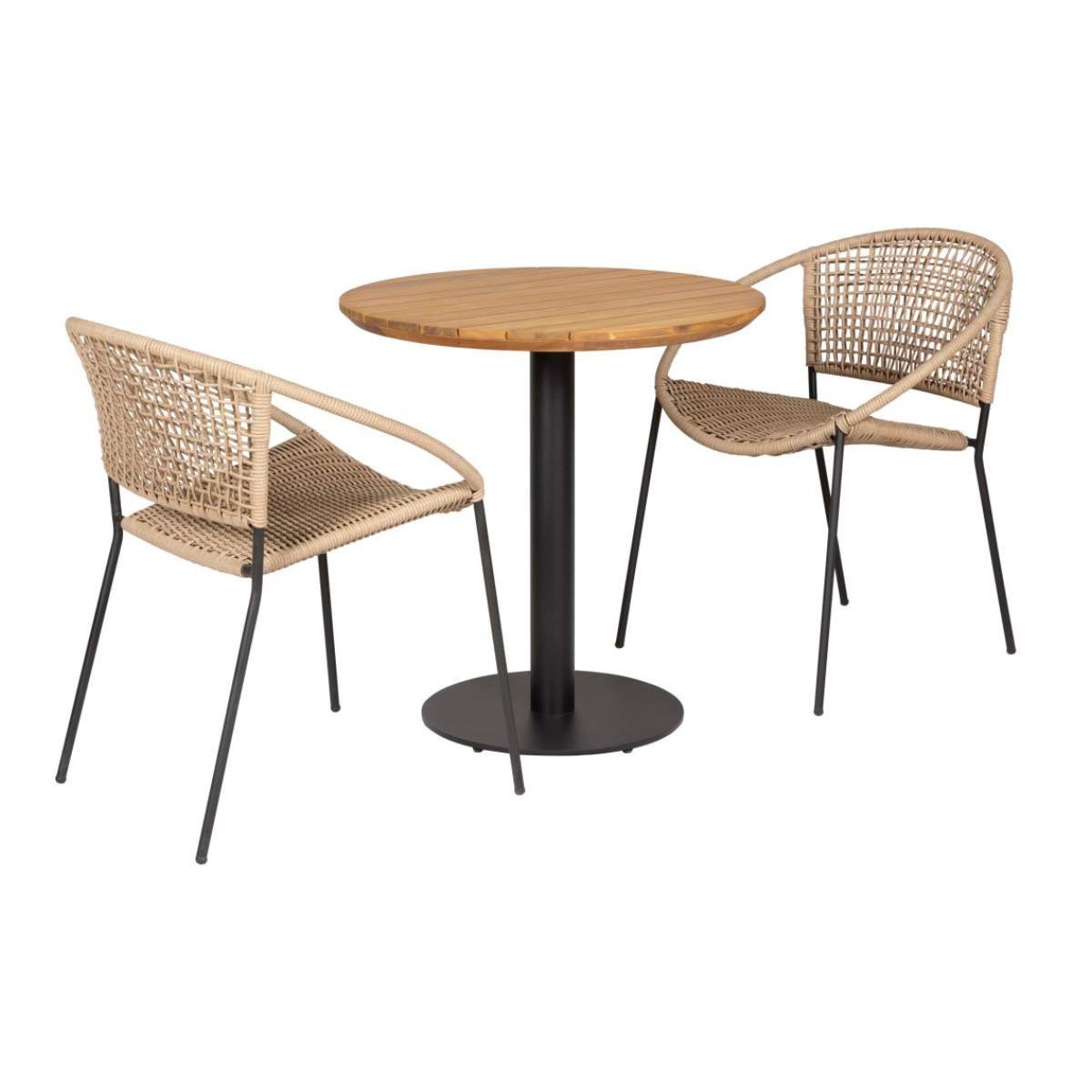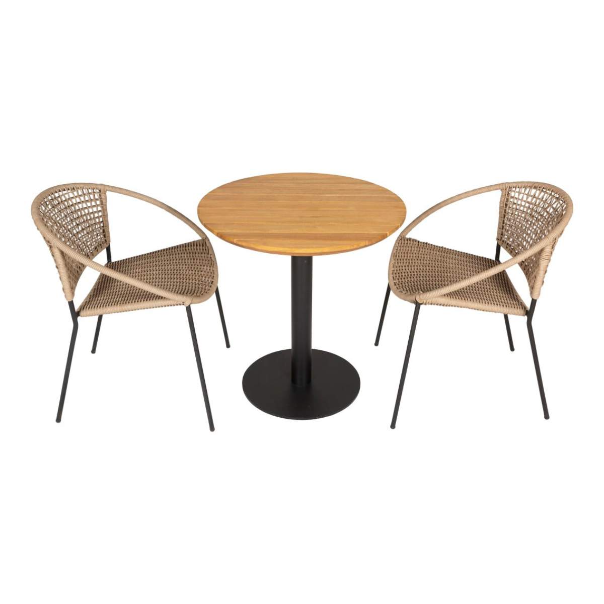 The Dakota Outdoor Bistro Set, made in Vietnam, features a minimalist design which makes use of sustainable light teak effect acacia wood to form the circular bistro style table top. The natural materials are complimented by a black powder coated aluminium frame and natural wheat colour rope weave.