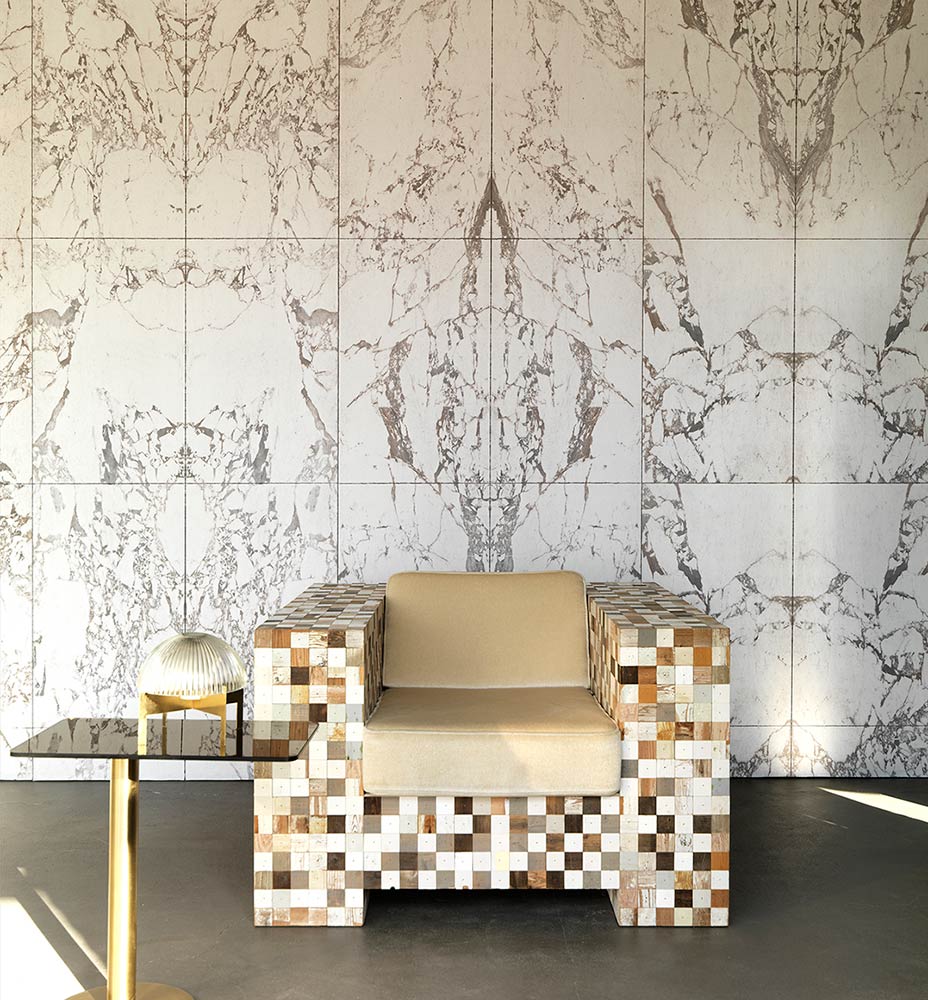 NLXL Materials Wallpaper PHM-41B Marbled Tiles, designed by Piet Hein Eek, has succeeded worldwide like its predecessor, Scrapwood Wallpaper. This collection provides an impressive trompe l'oeil effect. Multiple companies have manufactured marble reproduction products previously, yet none have accomplished it with the precision NLXL achieved in this endeavour.