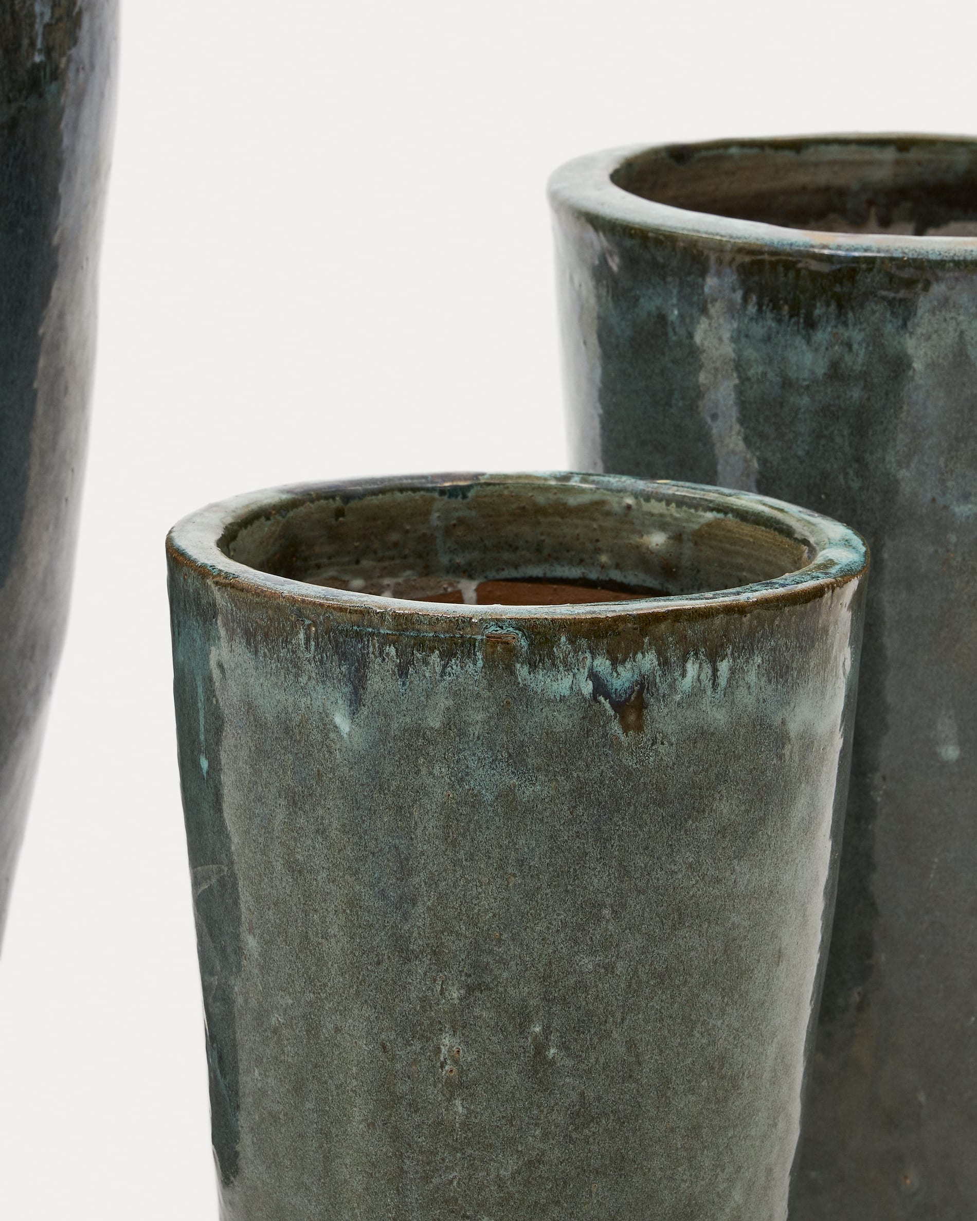 Rotja set of 3 terracotta planters with glazed blue finish in size 26 / 35 / 47 cm. Terracotta is a natural material that helps control humidity due to its breathability. Terracotta provides unique and unrepeatable tones and textures to each piece. The planters are suitable for both indoor and outdoor use as they are resistant to moisture, diverse weather conditions, and extreme temperatures.