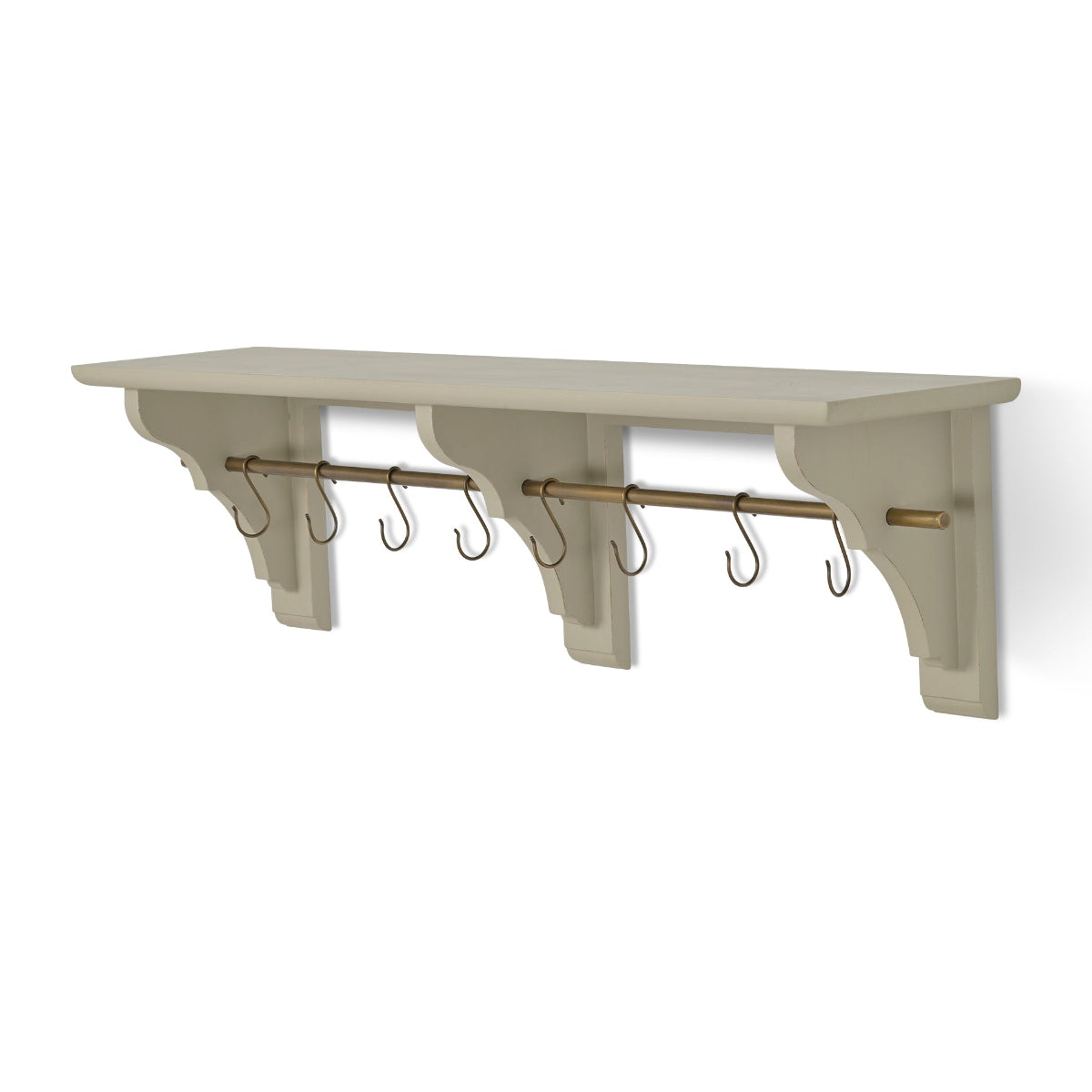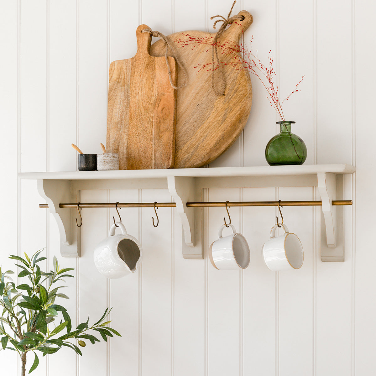 Our Walcote Shelf puts the finishing touches on a cosy kitchen space. The top shelf of this medium version is perfect for displaying recipe books, storage jars and houseplants, while the antique brass rail that features below it has eight hanging hooks for keeping utensils, tea towels and other bits and bobs neat and tidy. Match with other furniture from our Walcote collection in clay to complete the look.