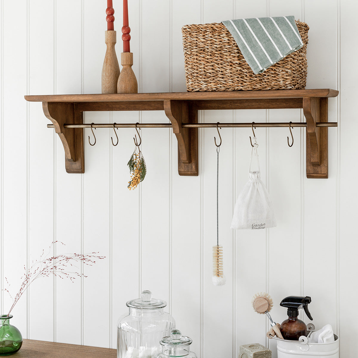 Enhance your kitchen's functionality with the medium-sized Walcote Shelf in natural wood. This stylish shelf offers ample space for lining up storage jars, cookbooks, and decorative items, adding both charm and practicality to your kitchen. Below the shelf, the antique brass rail features eight hooks, perfect for keeping kitchen utensils and tea towels within reach.