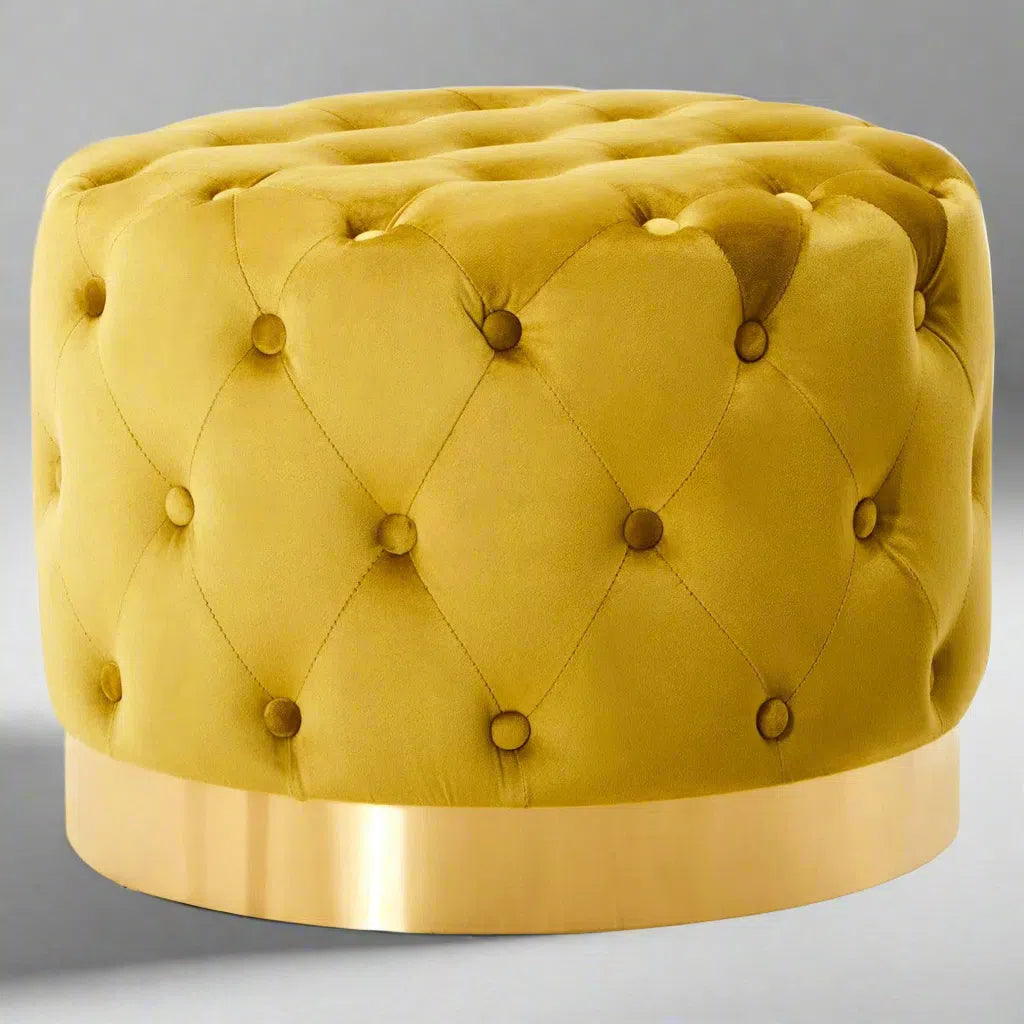 The Lorenzo stool features luxurious pistachio velvet upholstery with elegant button tufting, perfect for high-end decor.