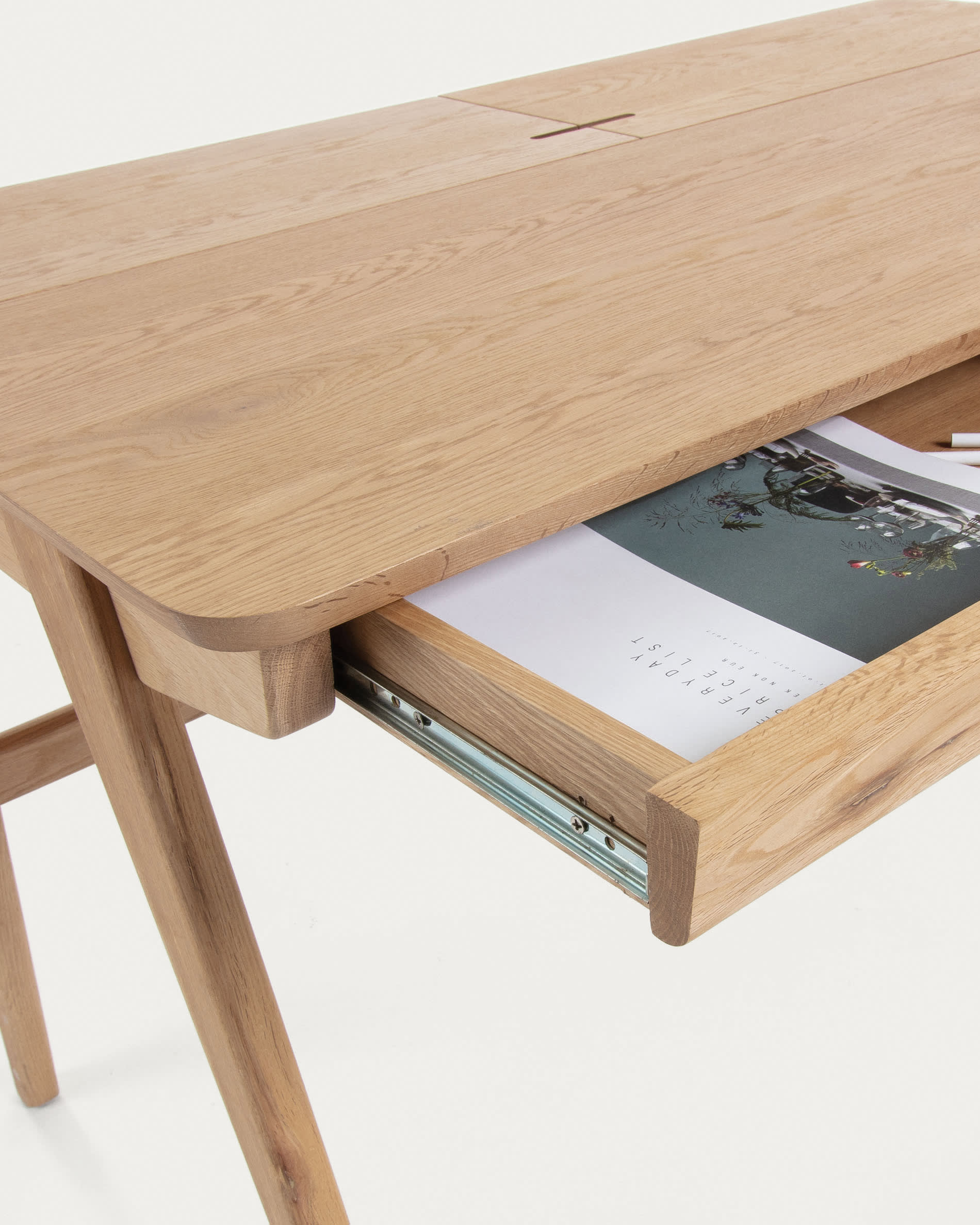 Crafted from natural ash veneer with solid ash wood feet, this desk features 2 drawers for convenient storage. It boasts a versatile design that complements any interior style and room layout. Assembly is a breeze, requiring just one person and a maximum of 10 minutes.