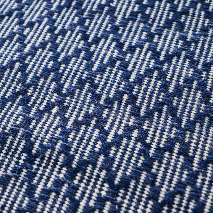 Durable indoor and outdoor rug with a textured Aztec-inspired design in denim blue and white. Non-absorbent, easy to clean, ideal for high-traffic areas or outdoor use.