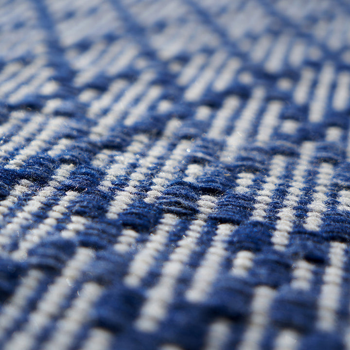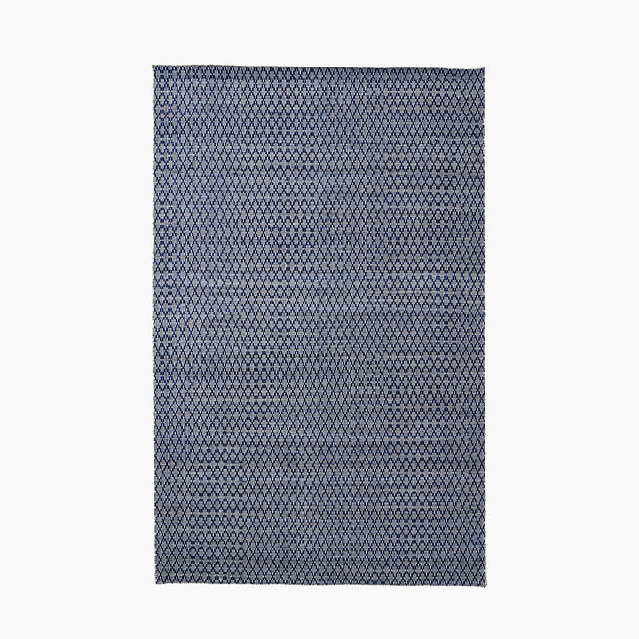 The PET Yarn range of indoor and outdoor rugs are made from recycled plastics, cleverly presented in thin threads of polyester yarn enabling our weavers in India to manufacture them into textured, yet non-absorbent rugs. This particular rectangular rug has an attractive design reminiscent of the striking Aztec designs, with a tonal, textured diamond being its trademark, in a mix of denim blue and white colourways. As this material is non-absorbent, it means you can happily use this rug outside and gently wash or brush off the dirt when needed. However, during prolonged periods of inclement weather, it is advisable to allow this rug to dry under cover when not in use. Of course, this rug can also be used indoors and is especially useful in high traffic or well-used areas due to its durable qualities and ease of maintenance.