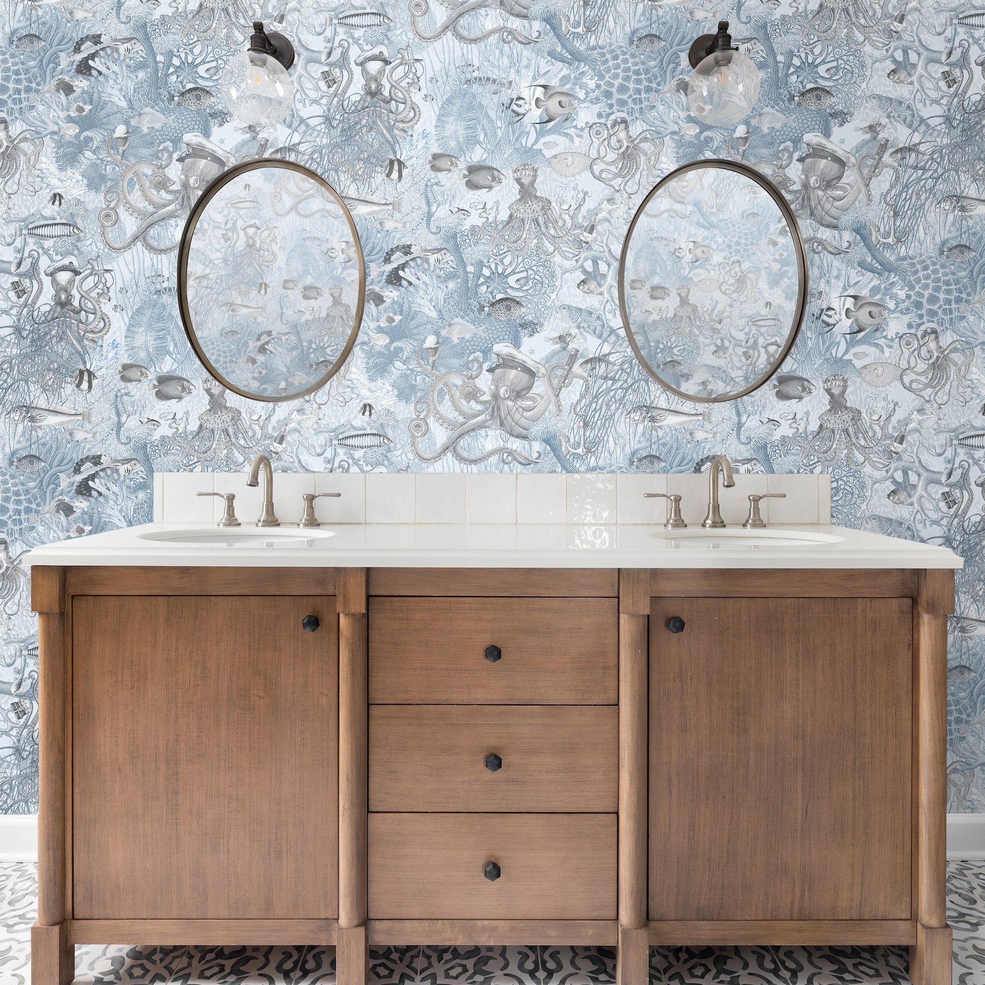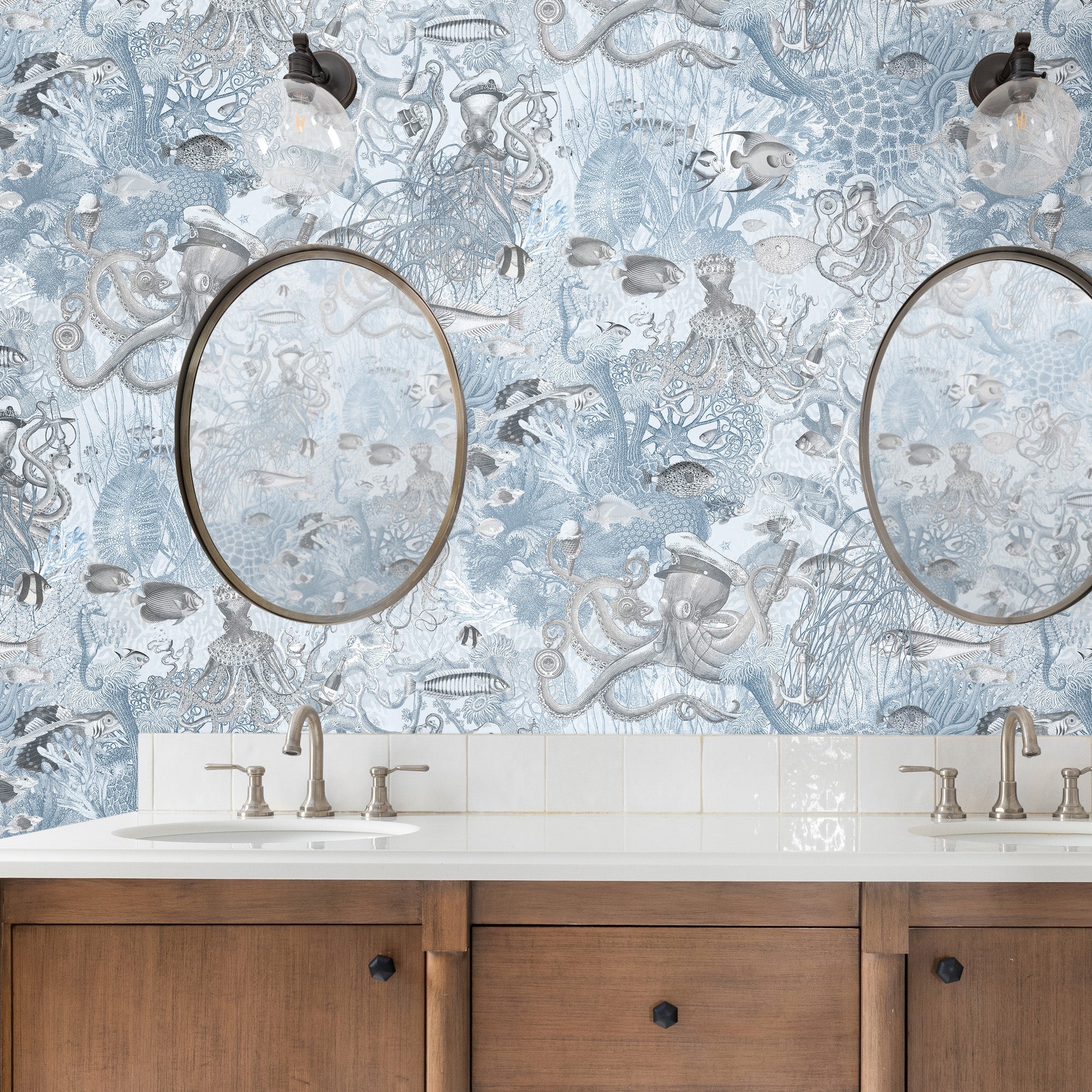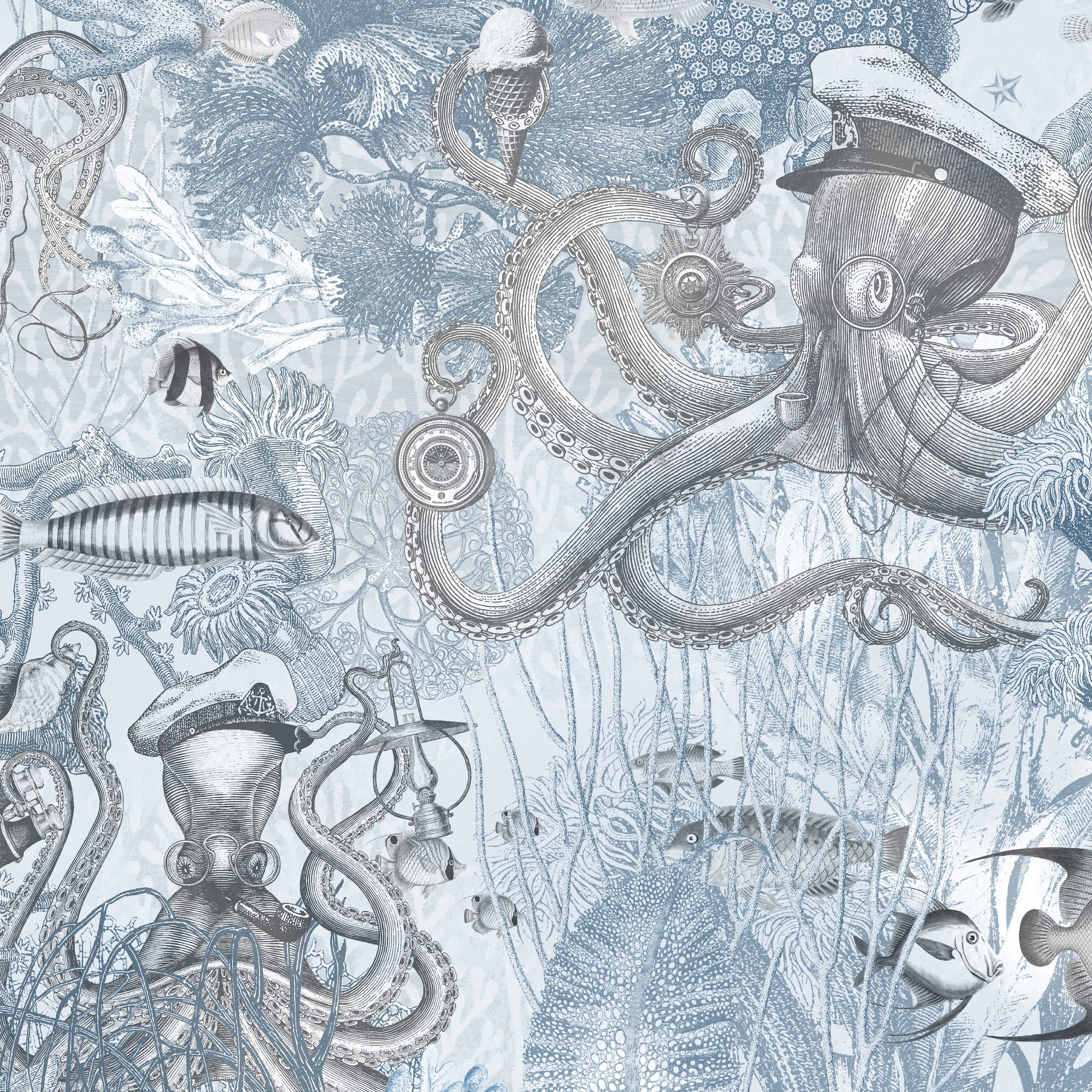 Immerse yourself in the vibrant depths of the ocean with Brand McKenzie's Octopus wallpaper in Pale Ocean. This elegant duotone sketch design brings an under the sea world to life, filled with calmness and tranquility. Bountiful coral formations and rich sea life textures set the scene, while a waggish octopus in a playful sailor hat adds charm and character to this captivating marine-inspired pale blue octopus wallpaper.