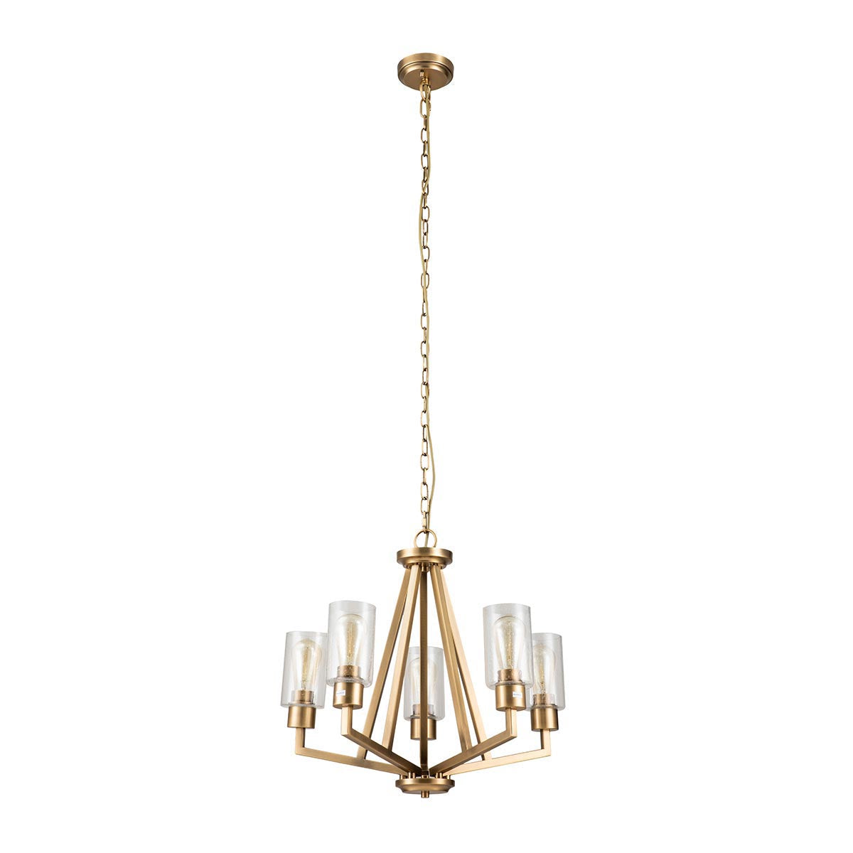 The Deryn 5-light chandelier, delivers a minimalist style with crisp, clean lines and an inverted diamond shape structure.