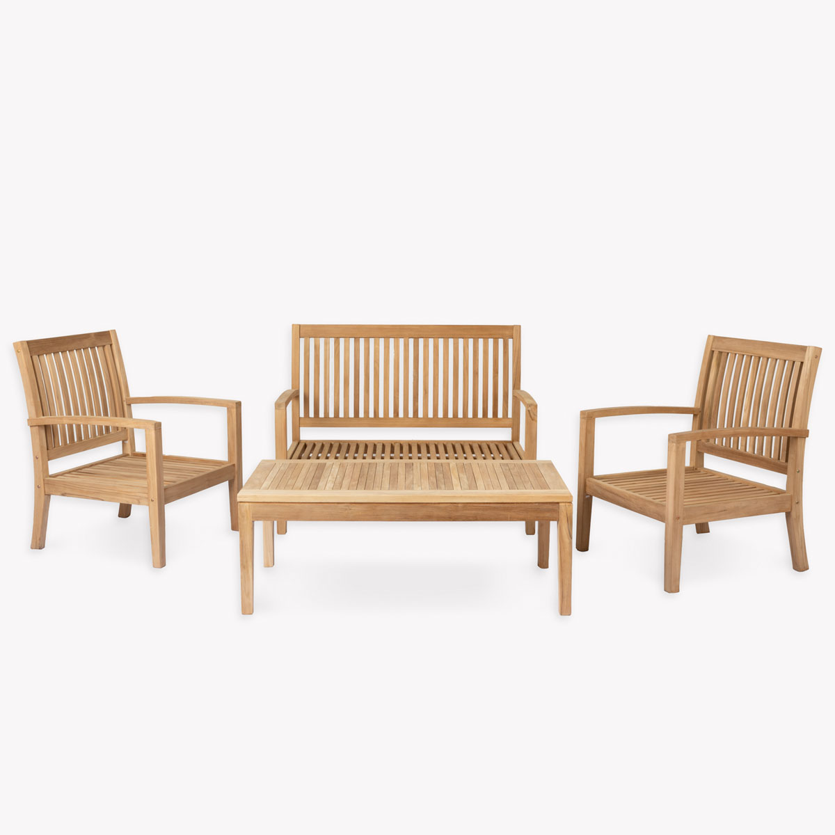 Furniture is delivered fully assembled within 3–4 weeks, ready to enjoy. This timeless teak set includes two armchairs, a two-seater bench, and a coffee table—perfect for creating a relaxed outdoor lounge. Handmade in Indonesia from solid, FLEGT-licensed teak, each piece is naturally weather-resistant, low maintenance, and finished in a warm natural tone. Designed for everyday use, it provides an inviting setting for morning coffees, family gatherings, or evening conversations. A true staple for outdoor living.