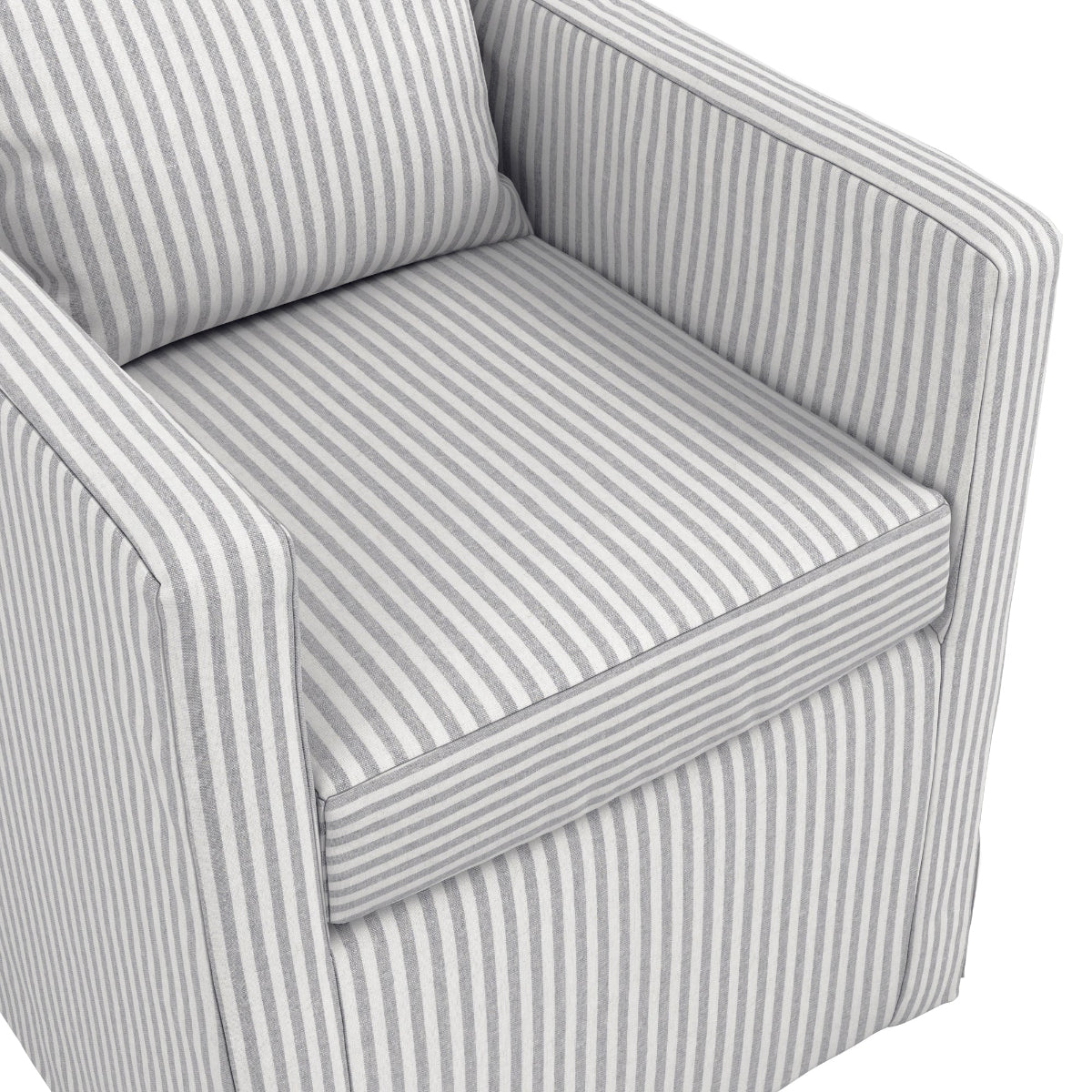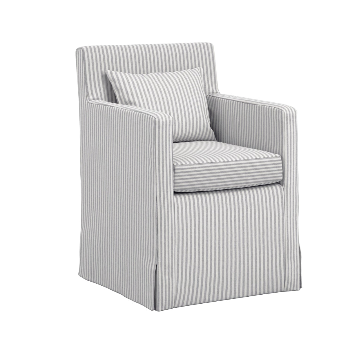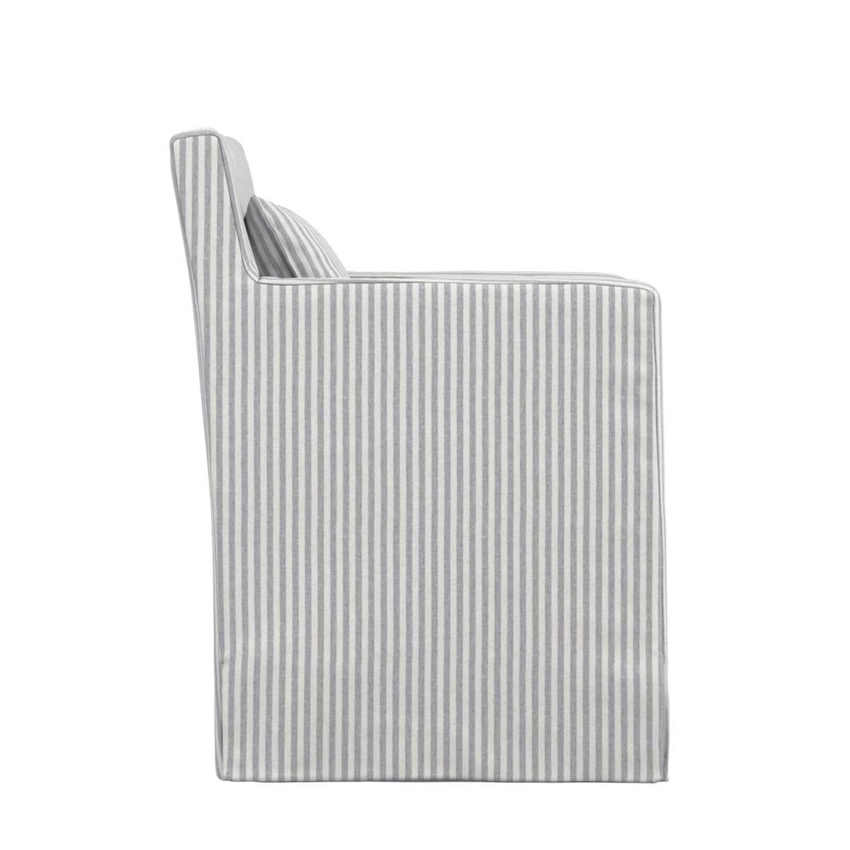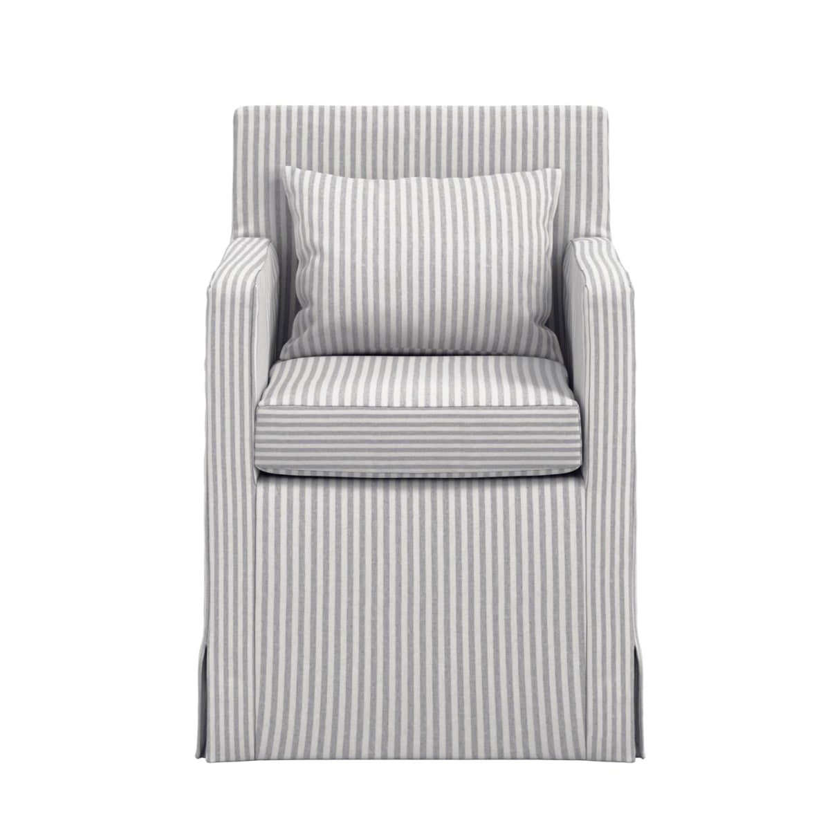 The Hettie dining chair blends timeless elegance with relaxed comfort. Upholstered in a grey thin stripe cotton blend fabric, its skirted design adds a refined touch to any dining space.