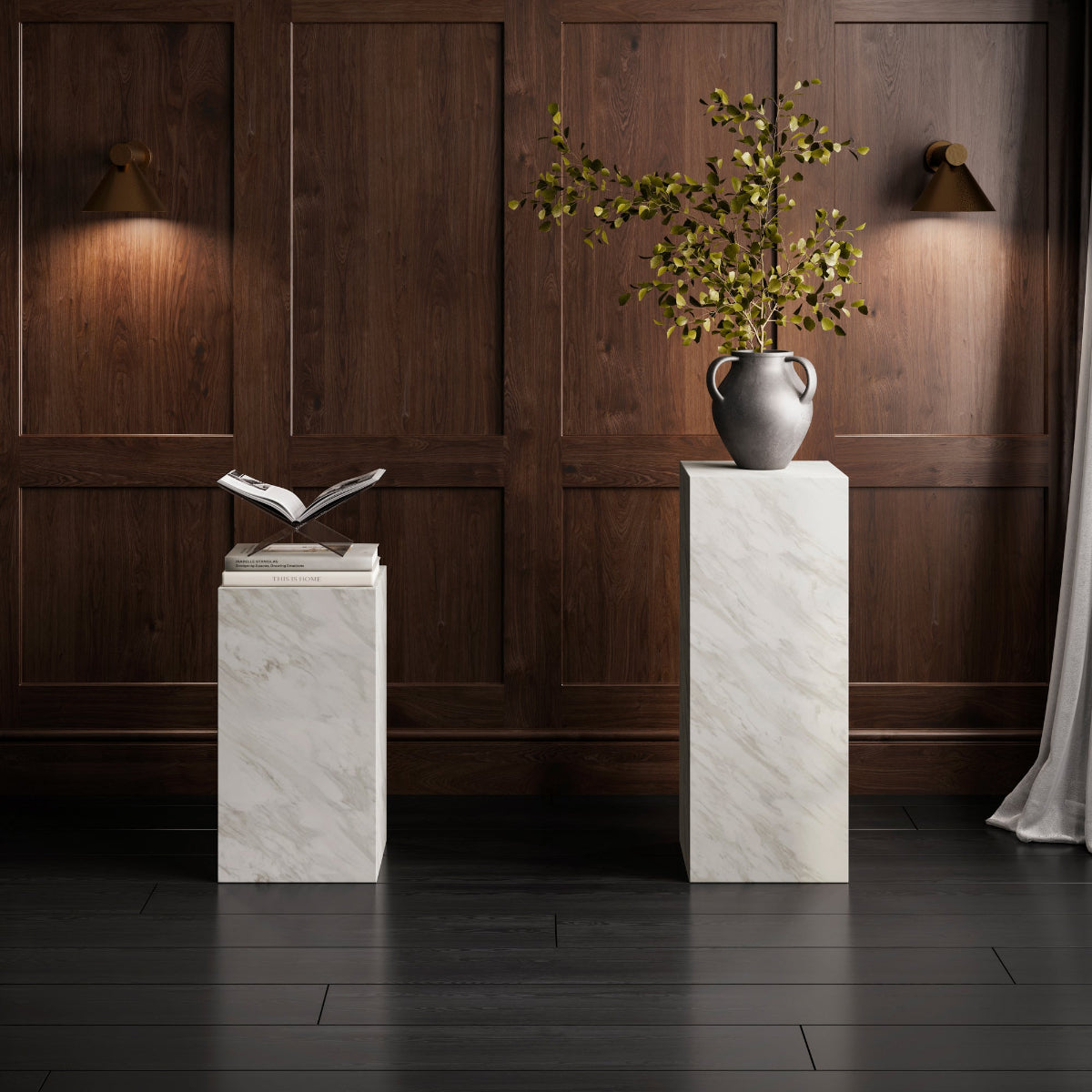 The Sur Pandora Small Pedestal Table is a refined stone marble pillar table designed to add elegance to any space. Showcasing a stunning white marble composite with soft neutral tones, it seamlessly blends with various interiors.