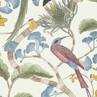 A hand-painted tree full of exotic avifauna and flora. Parakeets and sunbirds nestle in the branches, surrounded by lush ginkgo leaves and protea blooms. hand-painted to create a movement that will gently meander down your wall. Available in moody dark navy, and softer tones.