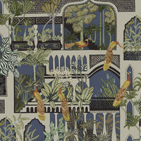This wallpaper design was inspired by Indian architecture. It is brought to life with lush foliage and playful peacocks. This pattern has a traditional geometric pattern set in architectural Doorways and Windows. All meticulously hand-painted.