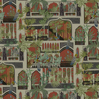 This wallpaper design was inspired by Indian architecture. It is brought to life with lush foliage and playful peacocks. This pattern has a traditional geometric pattern set in architectural Doorways and Windows. All meticulously hand-painted.