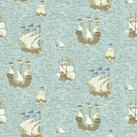 Josephine Munsey presents floating ships making a fantastical journey through blue seas. This design presents an amusing take on a traditional subject adding a whimsical charm to any interior.