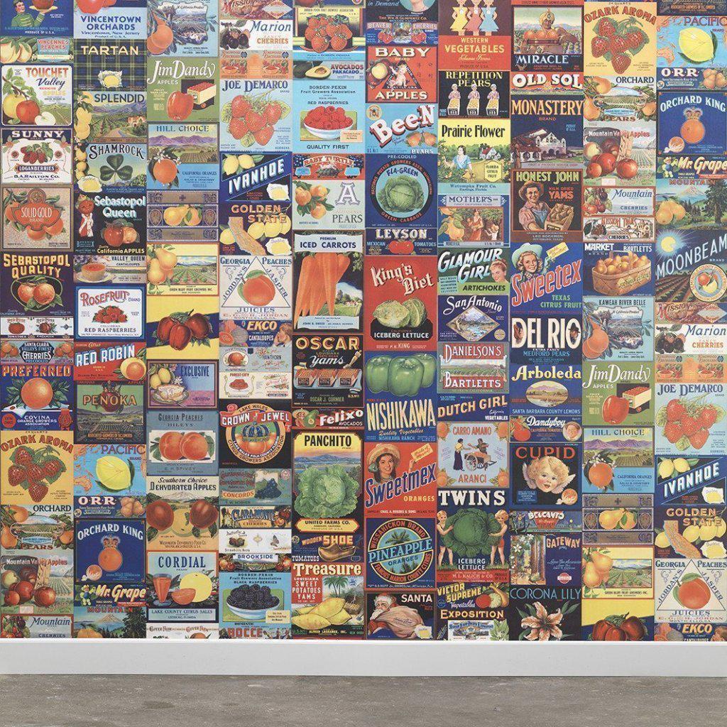 NLXL Crate Labels Wallpaper MRV-08 by Mr and Mrs Vintage is a custom size mural. Colourful and exciting, these retro 'Crate Labels' depict Fruit & Vegetables for a show-stopping display on any wall.