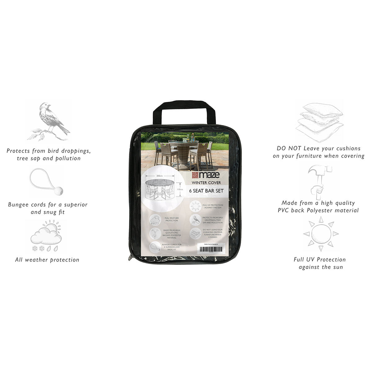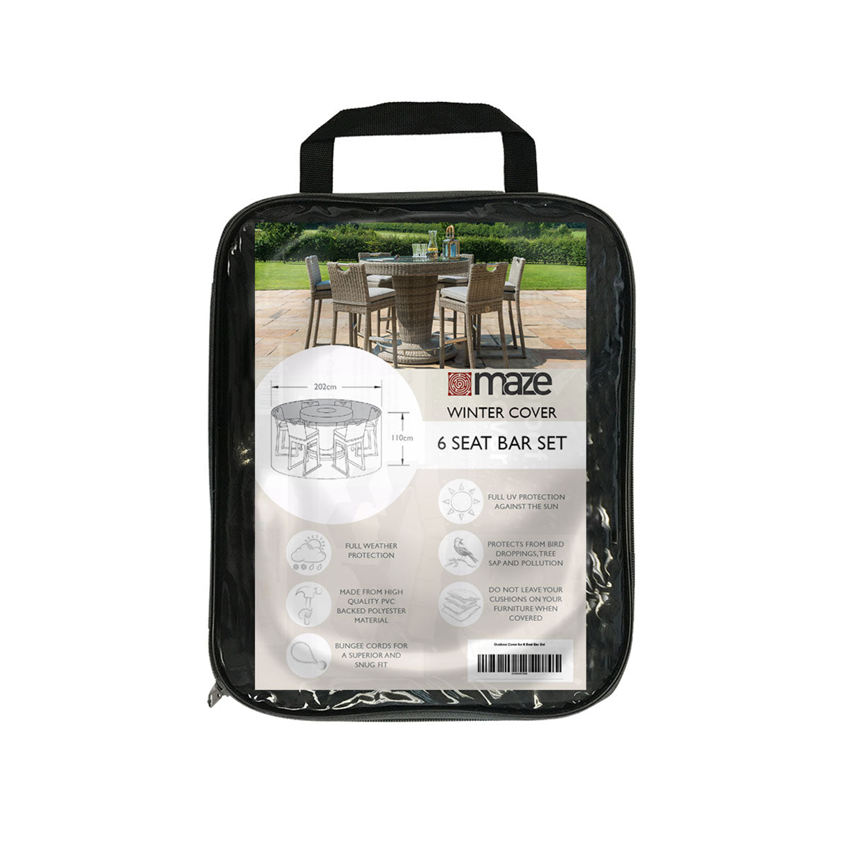 The Winter Cover for the Maze 6 Seat Bar Set is the ideal winter protection for your garden furniture. Manufactured from Maze’s premium outdoor material, we can guarantee their covers will provide superior protection from the elements.