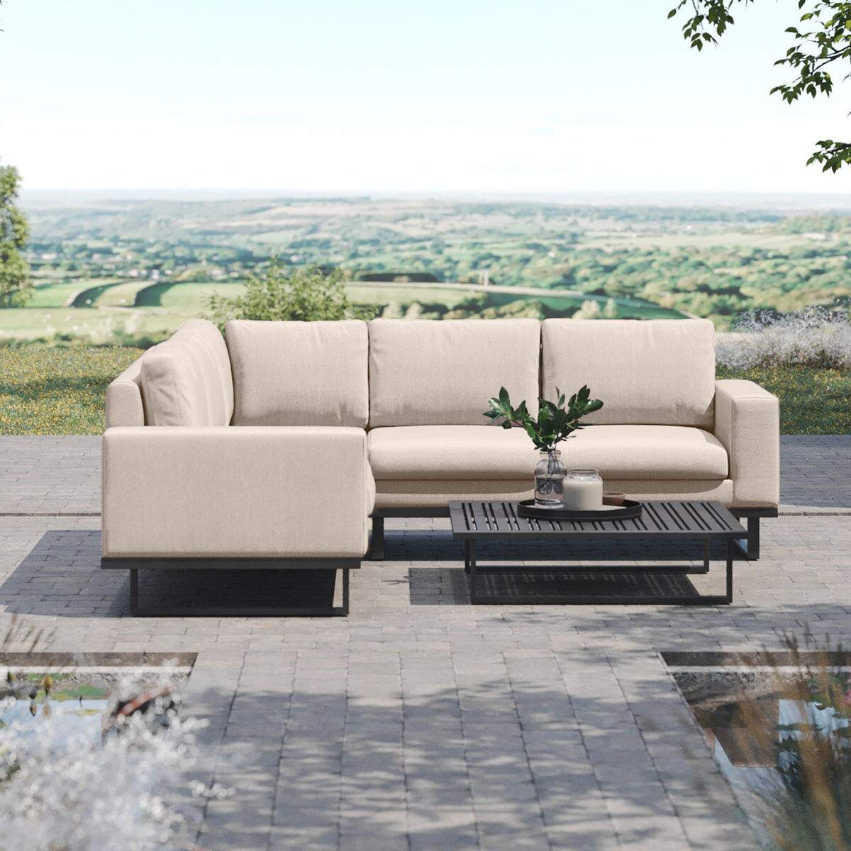 The Maze Ethos Corner Sofa Group in natural oatmeal colourway is an all weather outdoor corner sofa which has been designed for both maximum lounging comfort and style, whilst also being engineered for a life in the great British outdoors. The natural colour of this garden corner sofa is designed to compliment both modern or cottage gardens and is truly on trend for this season. Included with this maintenance free garden sofa are the corner sofa which comprises of a 2 seat left, 2 seat right and corner section, plus a durable aluminium coffee table, ideal of afternoon drinks.