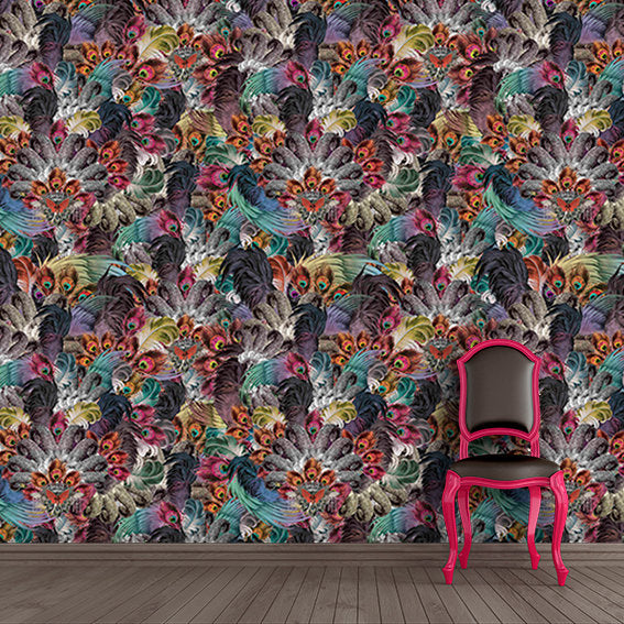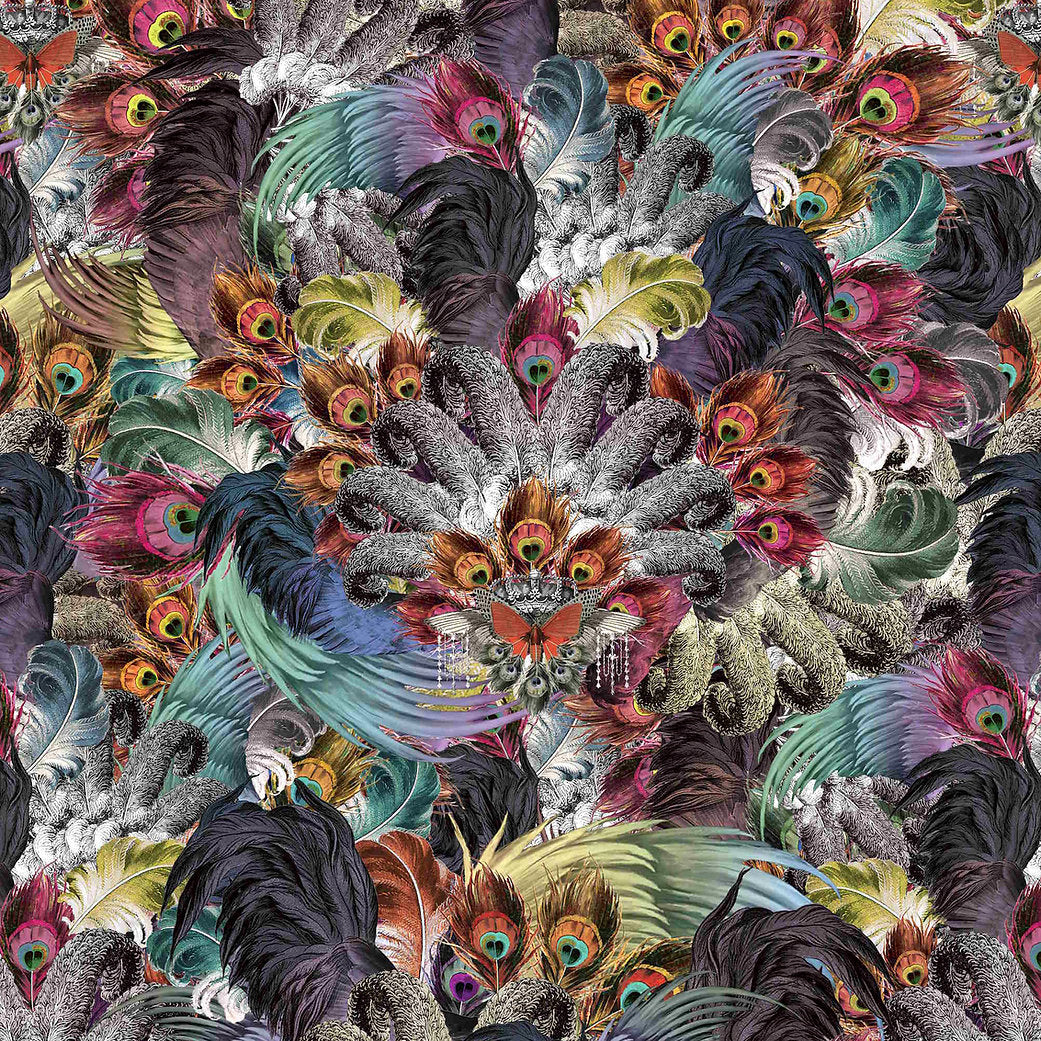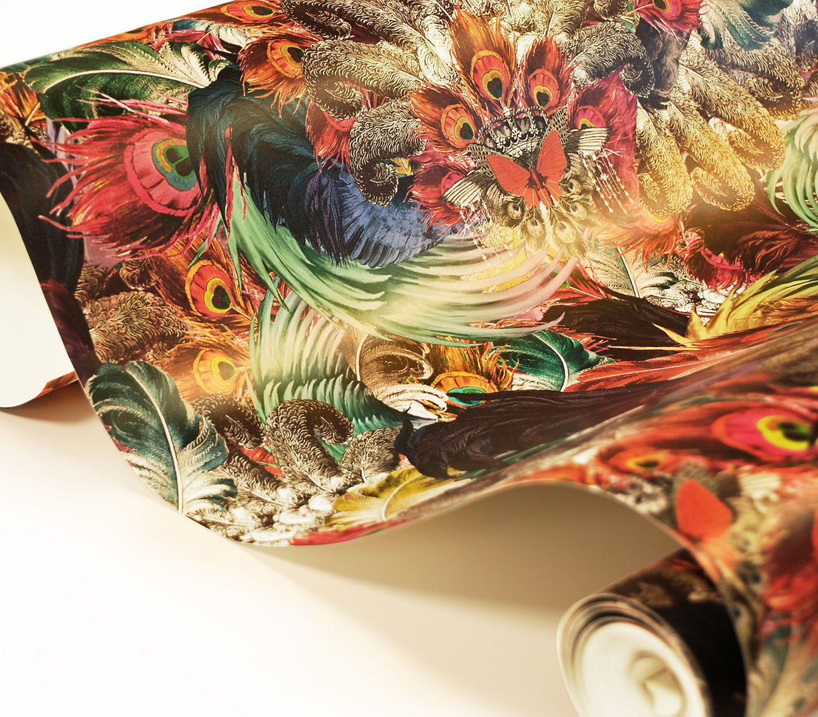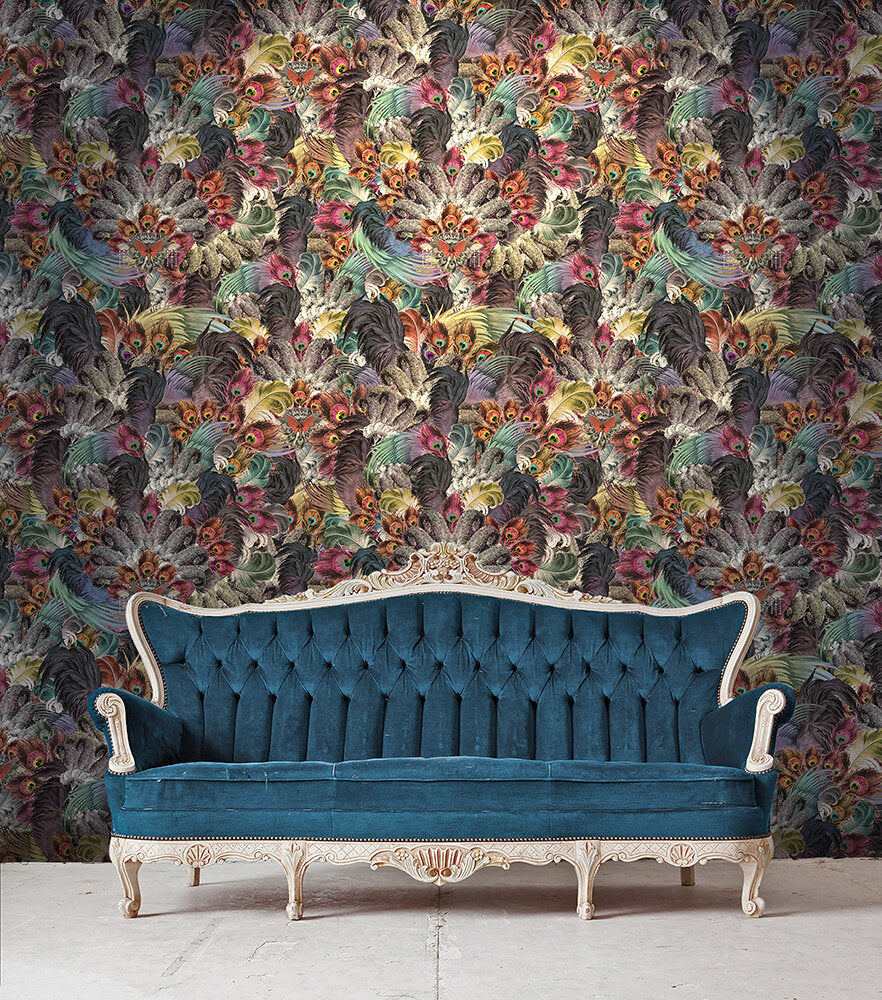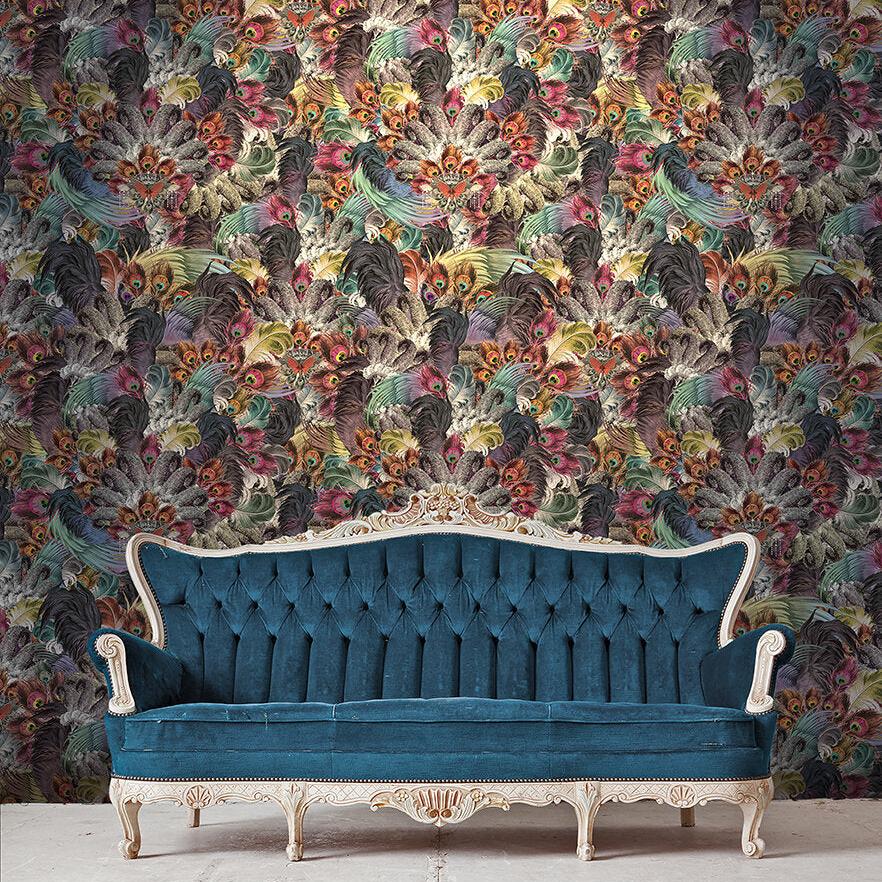 Santorus Wallpaper design, Madame De La Soir in Amethyst. This beautiful pattern sees a magnificent array of peacock feathers, ostrich plumes and dove wings, which display a warm hint of metallic gold as the light catches.
