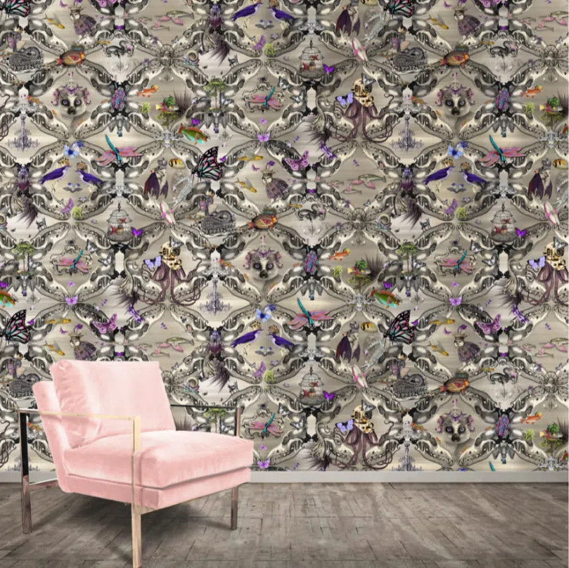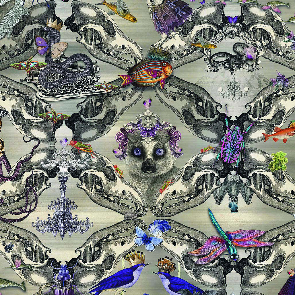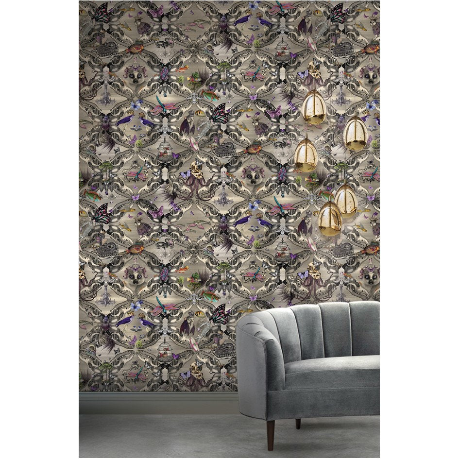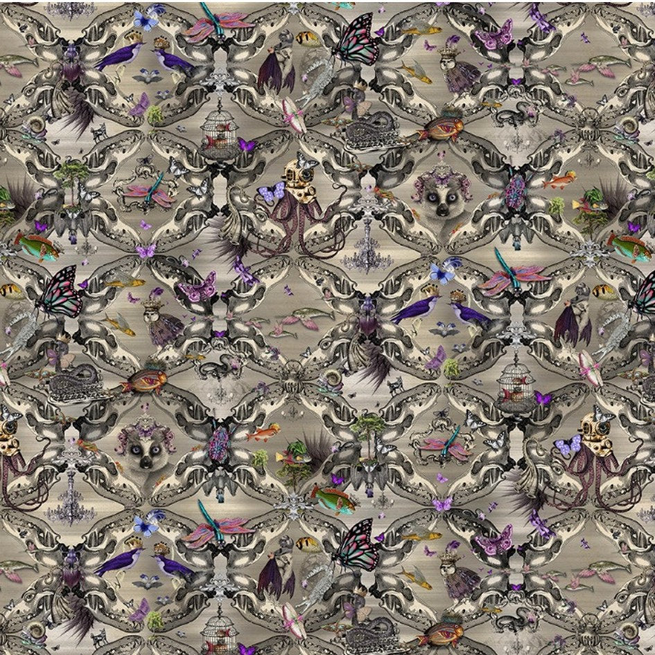 Showcasing a variety of creatures dressed to impress, you will be taken on a luxury safari to modern Arcadia in this Menagerie Silver wallpaper. Indulge in the design and discover even more marvels with every glance as the creatures peek out from the silky silver background and join the rich purple tones of the foreground, uniting as one. This wallpaper truly is full of surprises.