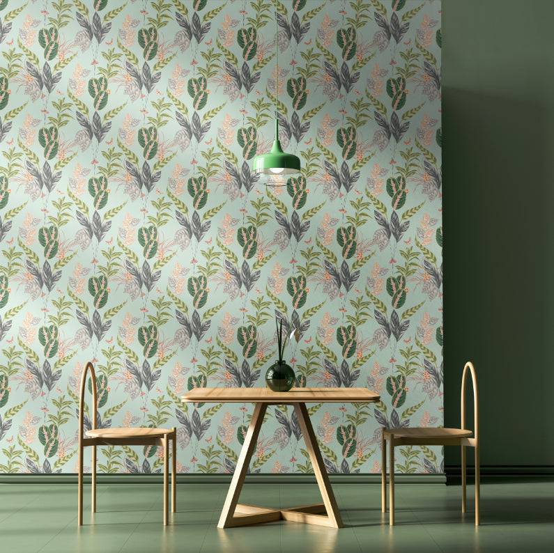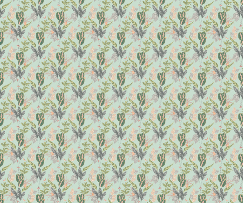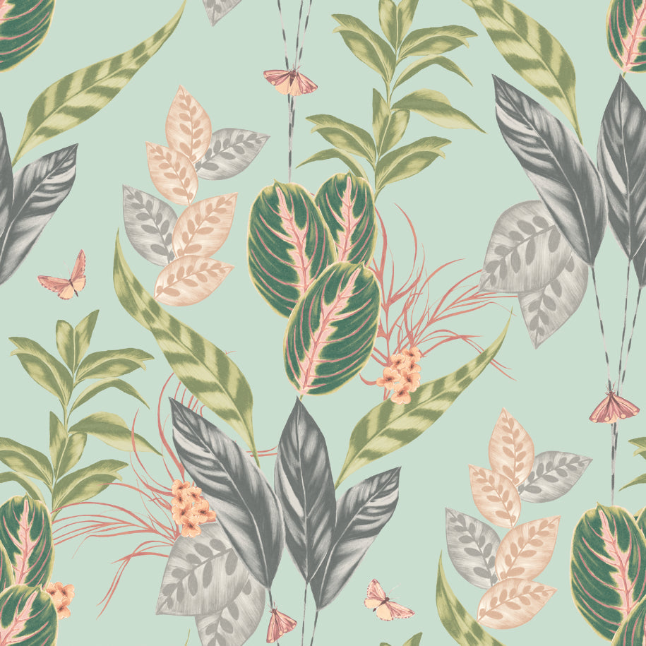 A multitude of butterflies, dancing and fluttering around this gorgeous pale green and pink tropical background. A positive design, bringing creativity, joy and life into your home
